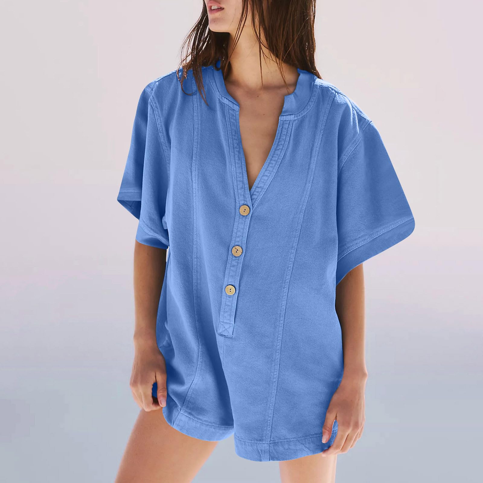 • Design Highlights - T shirt romper with cute and unique neckline design: super V-shaped back, but a simple and classic button down neck design from the front