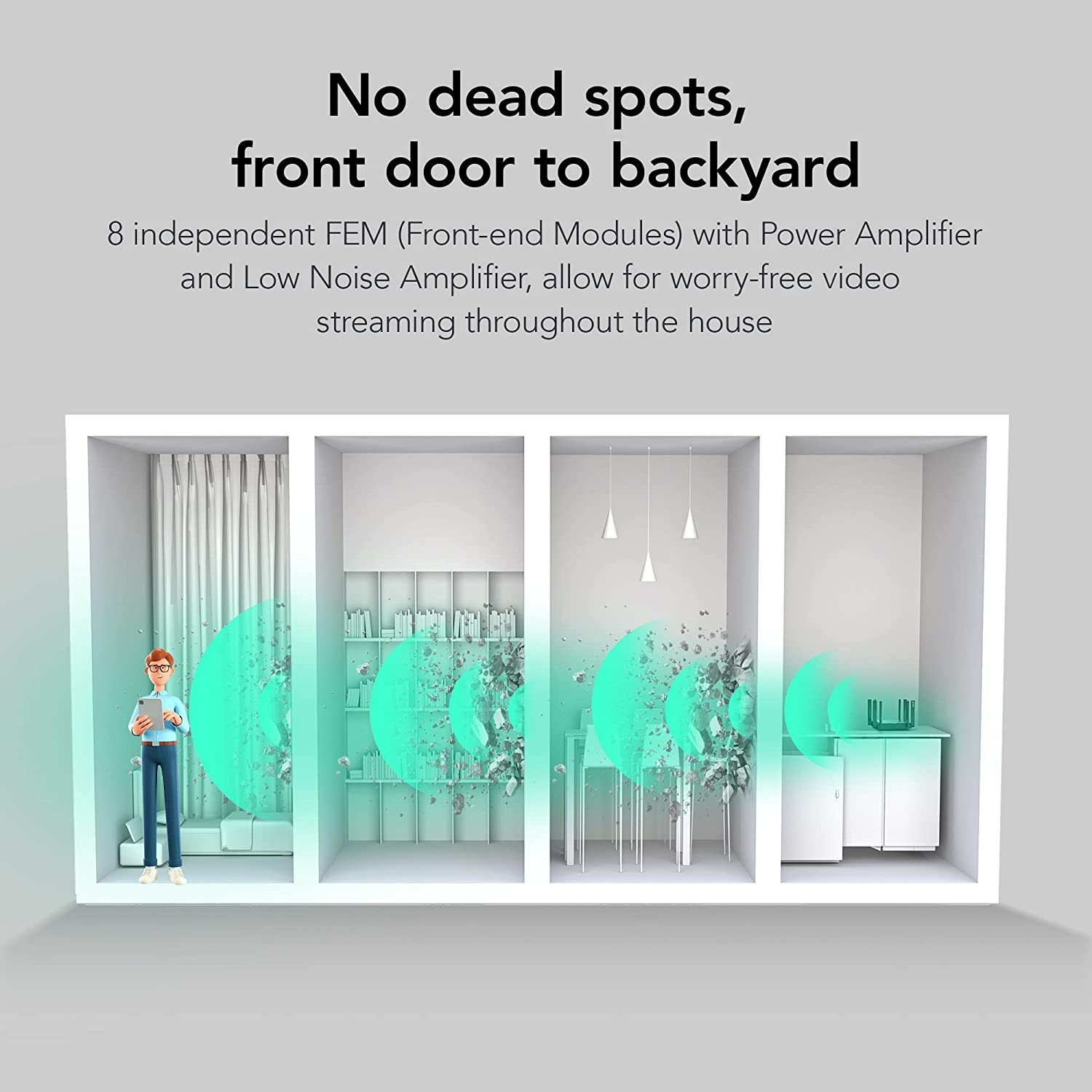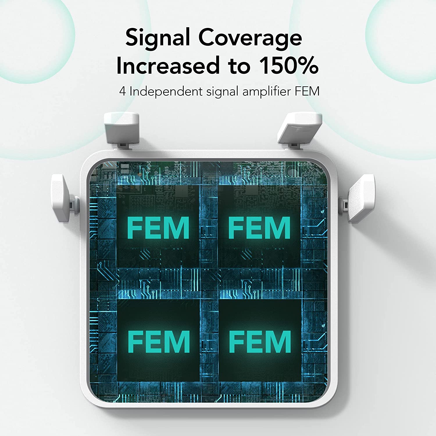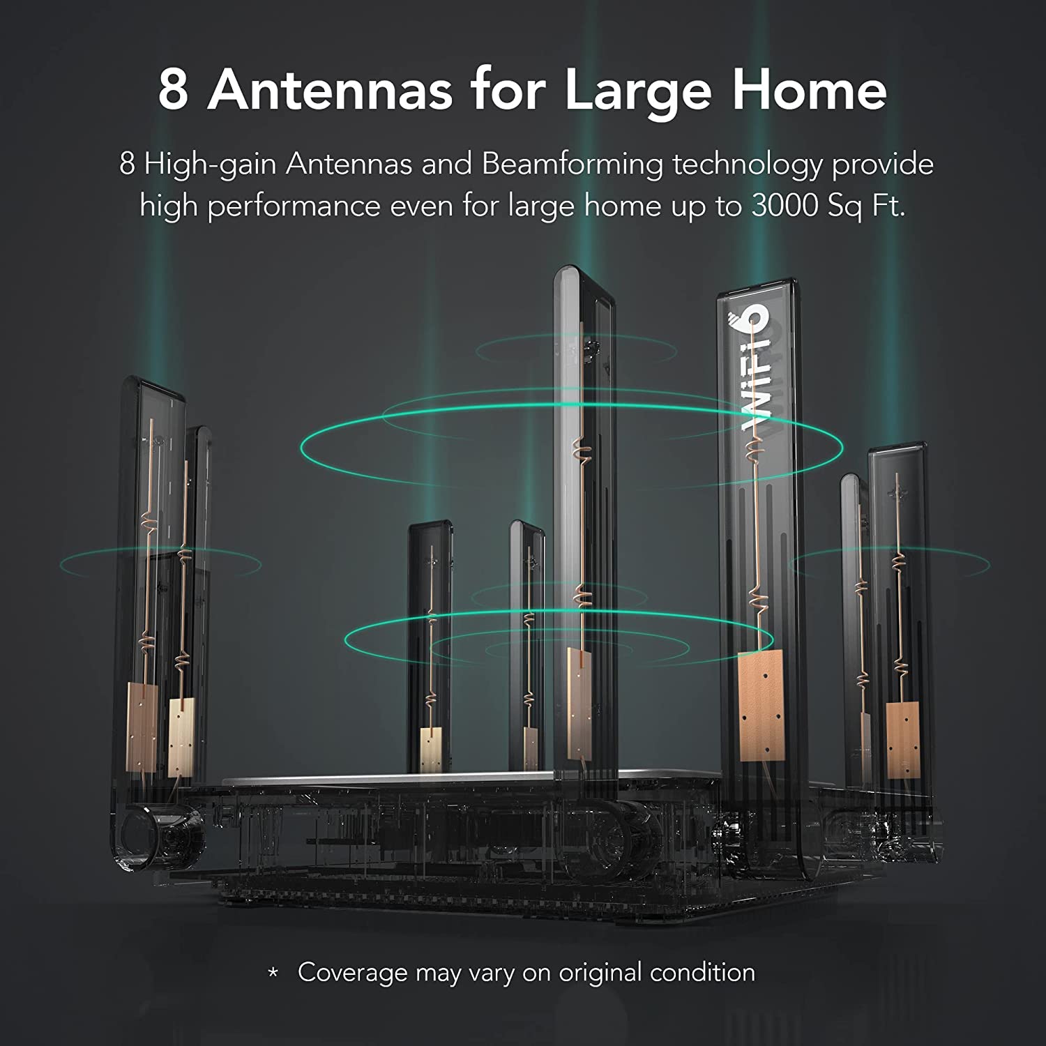 • Better Signal: This Wi-Fi 6 Wireless Router includes eight omnidirectional antennas with 4+4 high-power FEM amplifiers. The wireless signal coverage can reach up to 2000 square feet when combined with beamforming filtering. The signal is stronger when it passes through one more wall than four antennas, and diverse room kinds are not afraid.