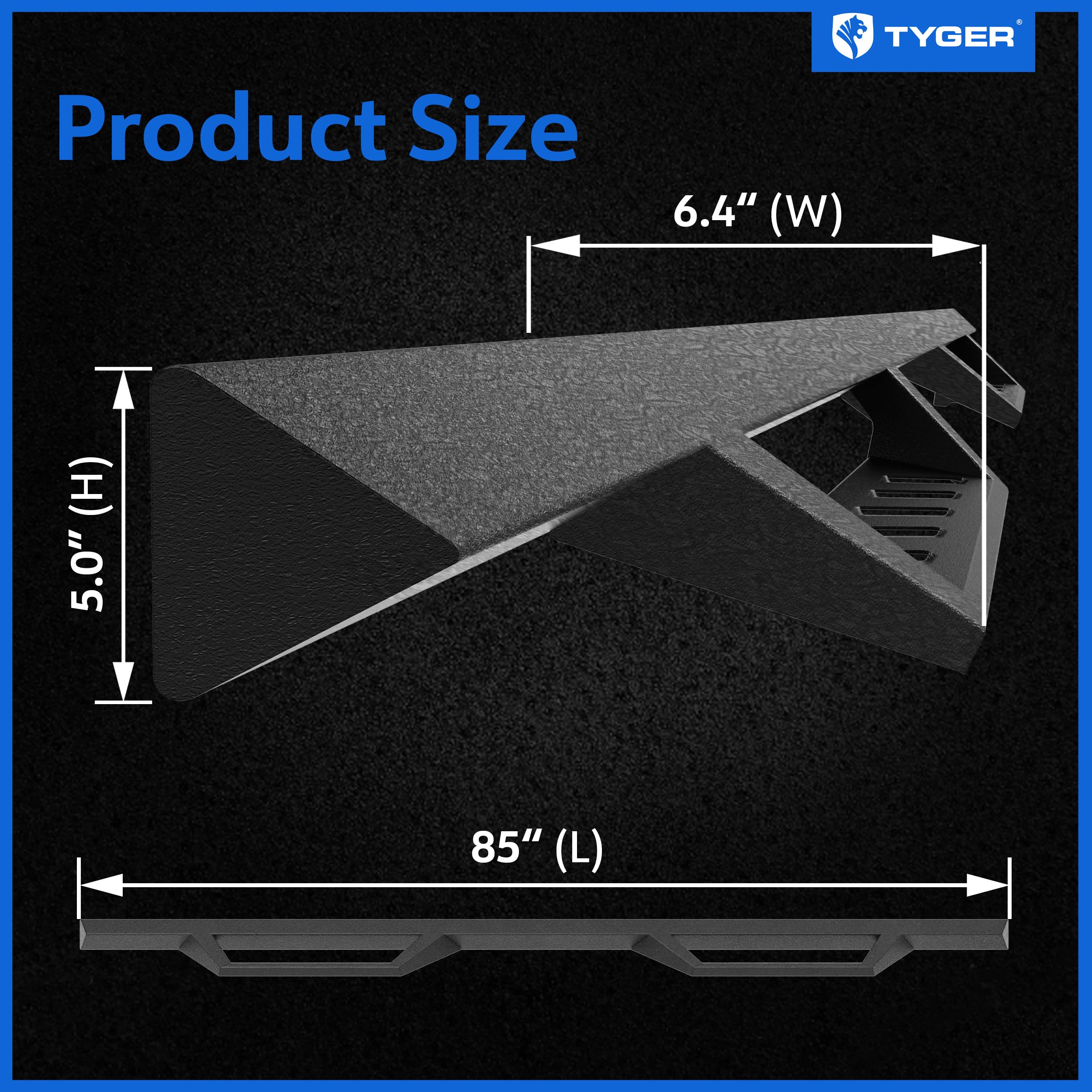 Details: NOT YOUR CLASSIC DROP STEPS - Tyger's LanderX triangular drop step nerf bar is the ultimate combination of refinement and functionality. Stylish looking triangular carbon steel tubing is designed and crafted to impress from all angles. All while offering the tube structure durable strength and support with a 5-inch drop, ensuring effortless entry and exit for you and your passengers. End-to-end, full body E-coating heavy textured powder finish provides superior dirt, water and rust protection while enabling the clean yet rugged look to these nerf bars. Discover the difference that sets LanderX apart and unlock the true potential of your vehicle.