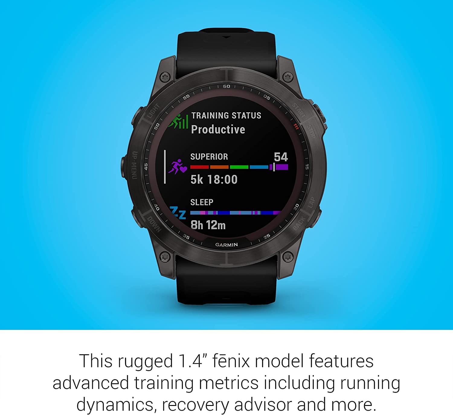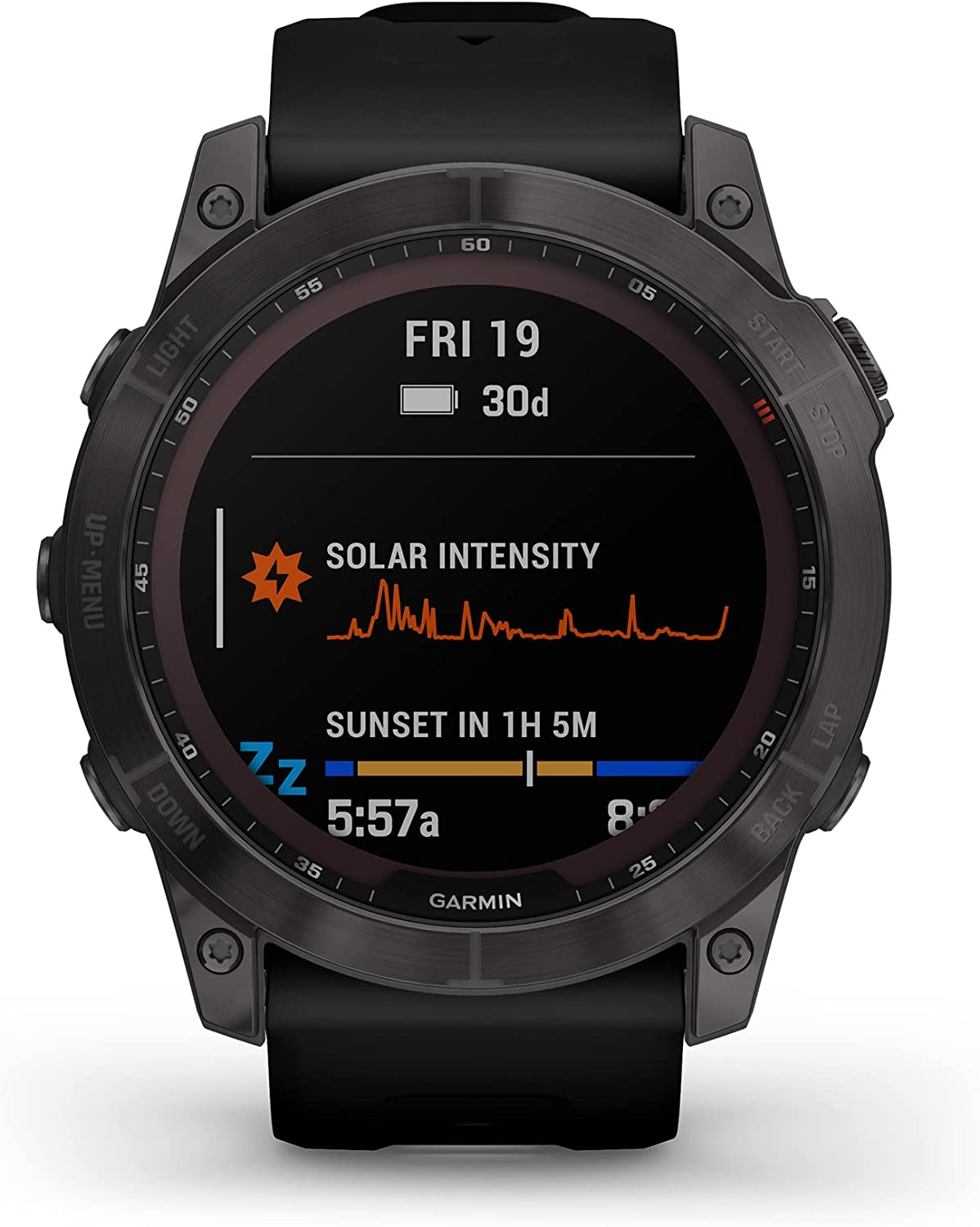 There are 7 days in a week. And the fēnix® 7X Sapphire Solar multisport GPS watch is built to go strong for all of them. Featuring a big 1.4” display, built-in LED flashlight and Power Sapphire™ solar charging lens, it has the long-lasting battery life to sustain your athletic and outdoor challenges. Use trusted button controls or the new touchscreen interface to access selections. Gain performance insights and metrics that help you manage your exertion and build stamina. Optimize recovery with 24/7 health and wellness monitoring of heart rate, respiration, stress, sleep and more this device is intended to give an estimation of your activity and metrics; it is not a medical device). Outdoor navigation sensors and new multi-band GNSS technology help guide you with a higher level of positioning accuracy, even in challenging environments. Plus, you’ll have preloaded TopoActive maps and worldwide ski and golf maps right on your wrist. To complement your tamer days, connected features include smart notifications when connected to a compatible smartphone, music storage and Garmin Pay™ contactless payments in supported countries and payment networks.