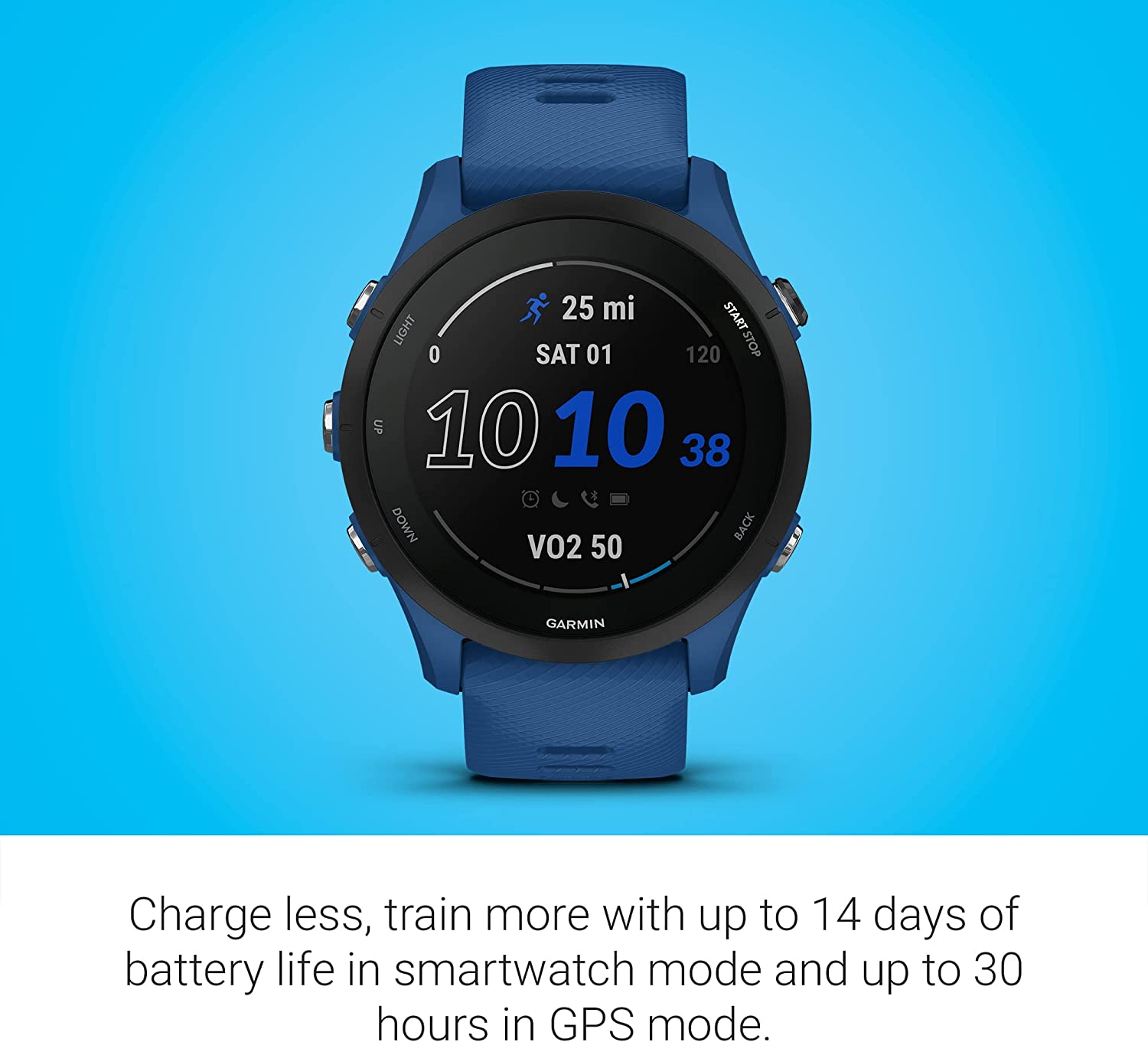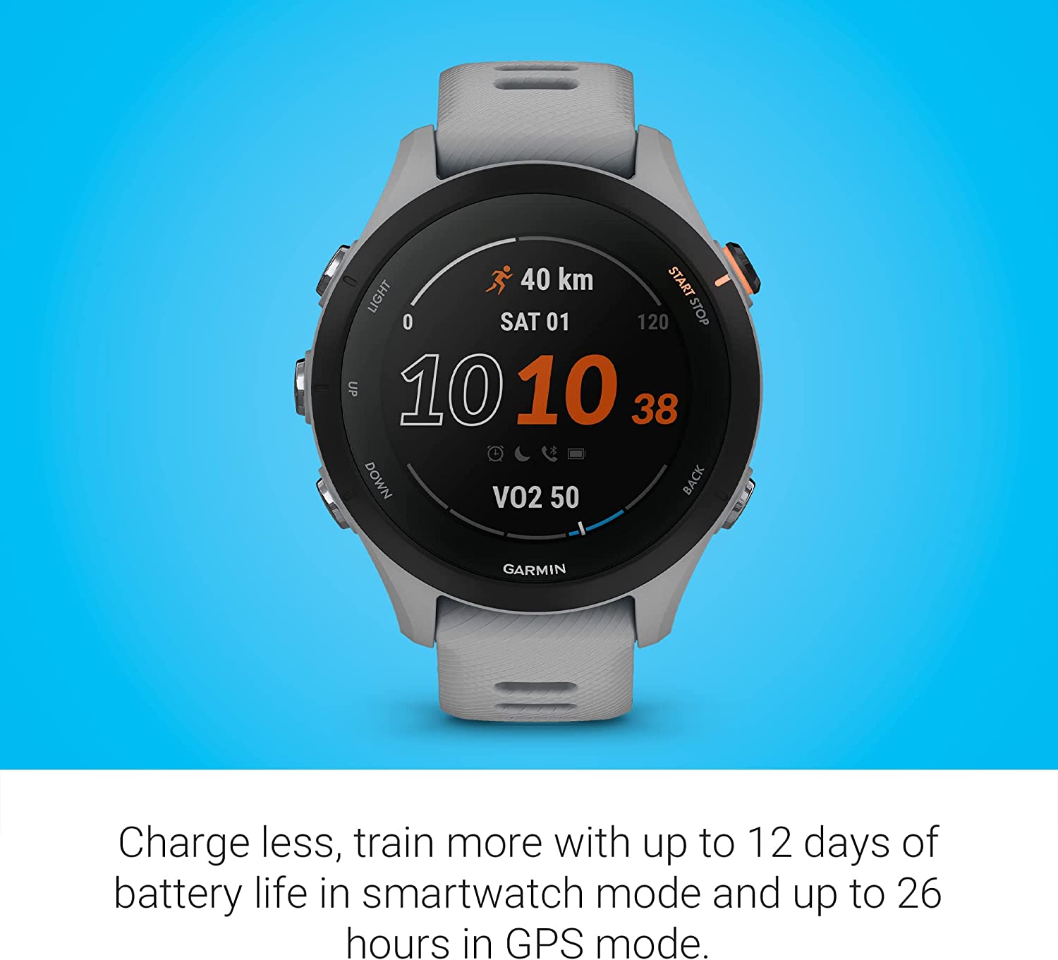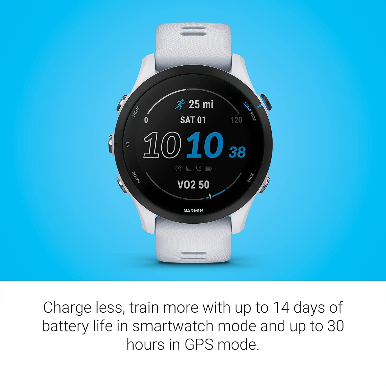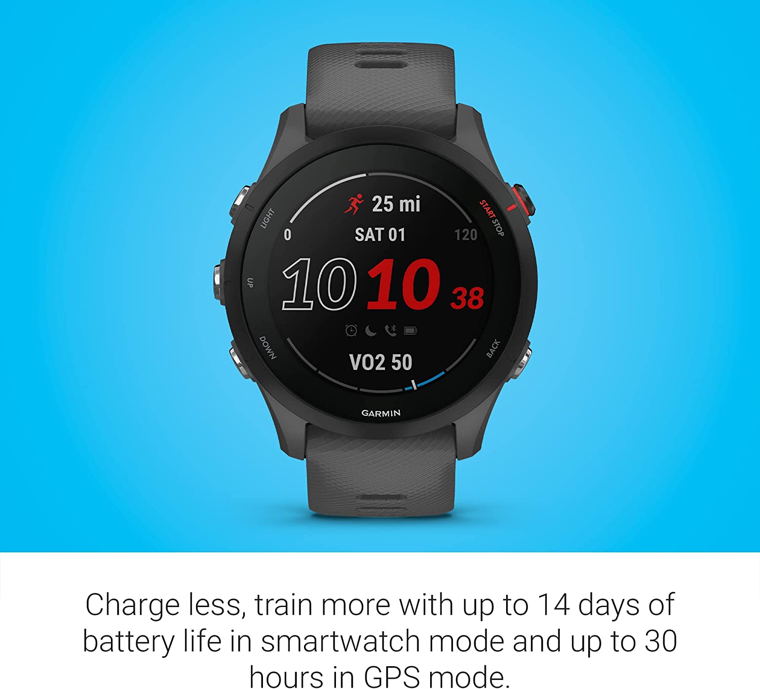 Run at a higher level with the Forerunner® 255S smartwatch. These running smartwatches help you train and recover smarter with training status, running power, multi-band GPS and daily suggested workouts that adapt to your performance and goals. Plus, other new features — such as race widget — help you plan your race-day strategy, and morning report with HRV status reveals your overall health alongside the day ahead. And with Garmin Pay™ contactless payments with a supported card, it’s never been easier to buy that post-workout coffee — no matter how you work out — with more than 30 activity profiles, including triathlon, cycling, swimming and more. With Forerunner 255, you can get a continuous picture of your health, from training and recovery to sleep quality and overall wellness — and with up to 12 days of battery life in smartwatch mode and up to 26 hours in GPS mode.