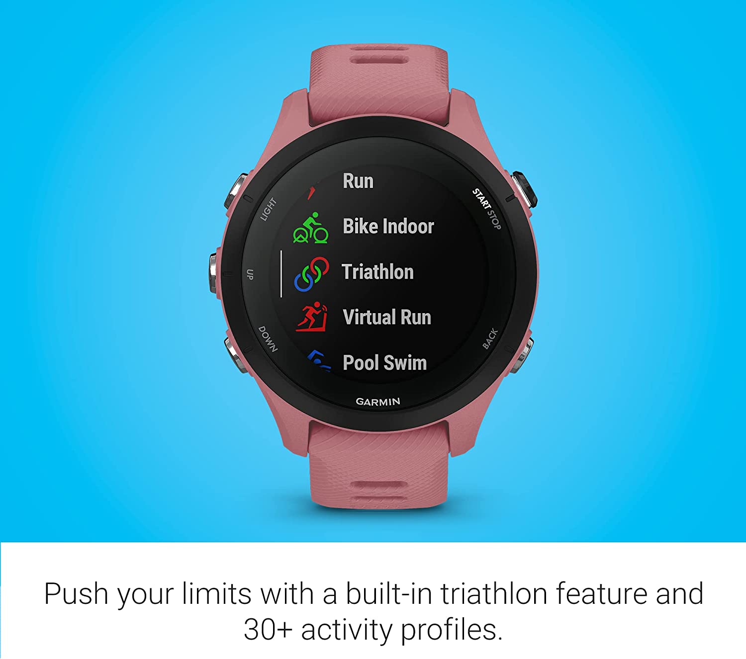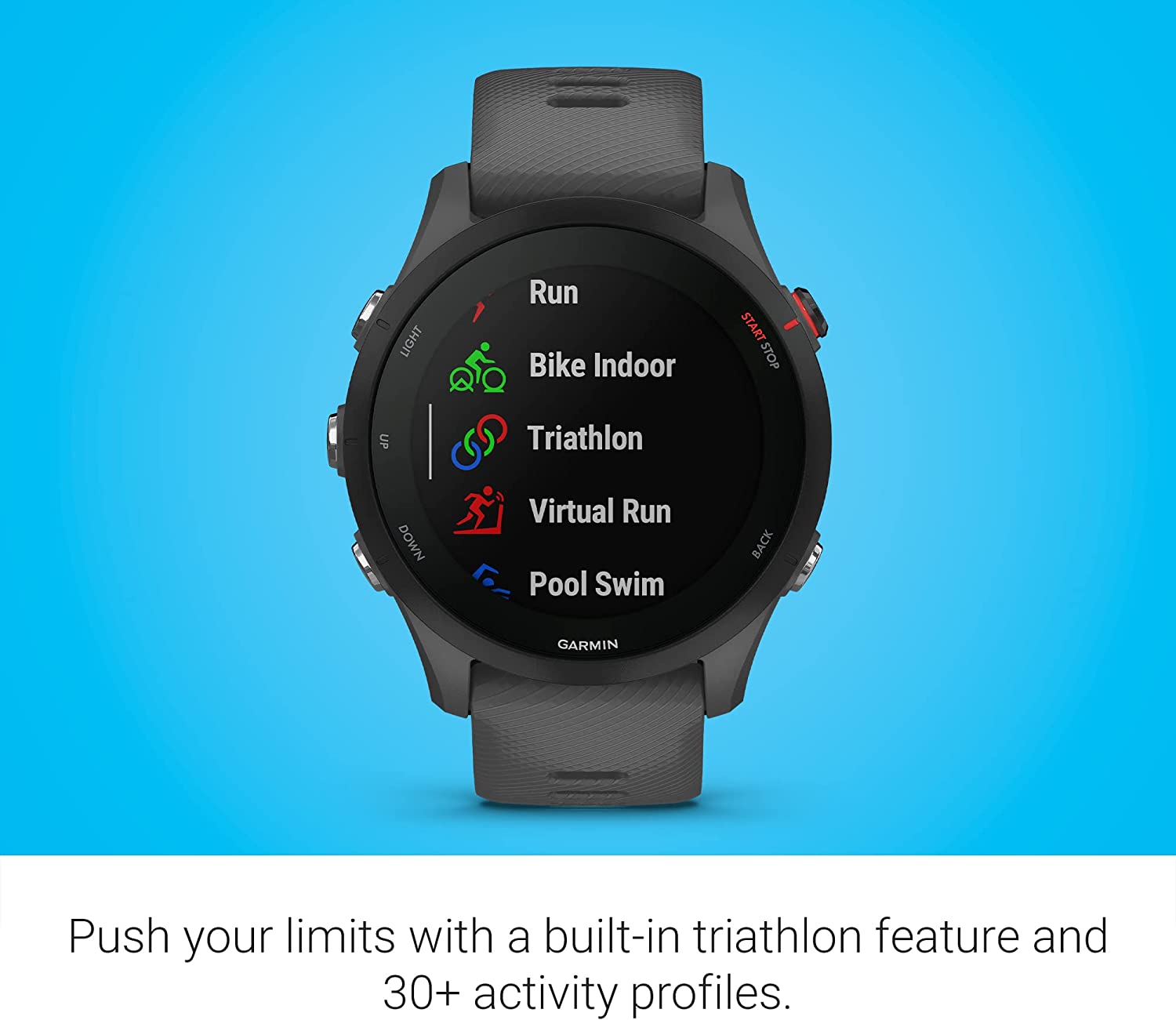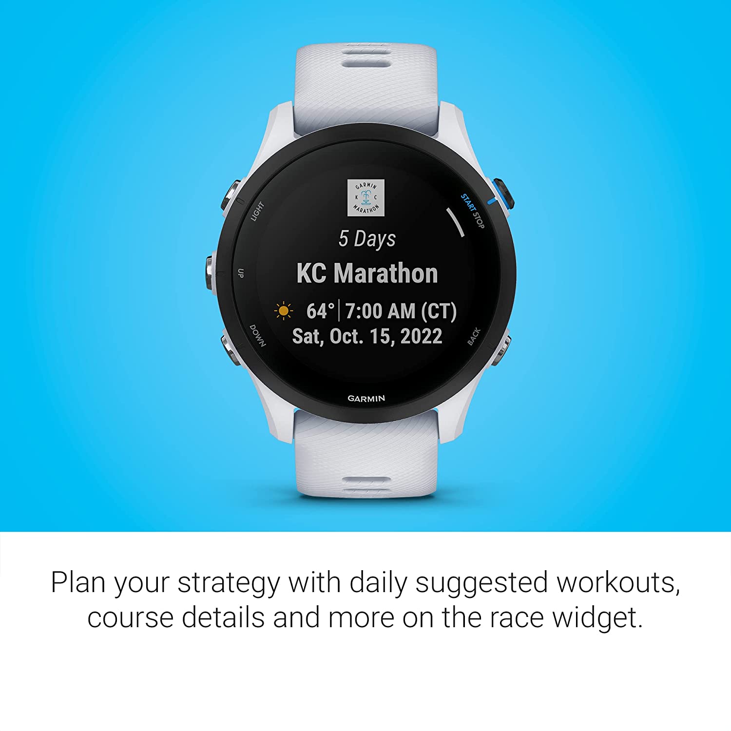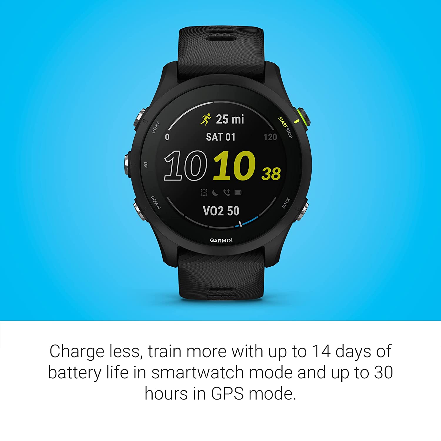 Run at a higher level with the Forerunner® 255S smartwatch. These running smartwatches help you train and recover smarter with training status, running power, multi-band GPS and daily suggested workouts that adapt to your performance and goals. Plus, other new features — such as race widget — help you plan your race-day strategy, and morning report with HRV status reveals your overall health alongside the day ahead. And with Garmin Pay™ contactless payments with a supported card, it’s never been easier to buy that post-workout coffee — no matter how you work out — with more than 30 activity profiles, including triathlon, cycling, swimming and more. With Forerunner 255, you can get a continuous picture of your health, from training and recovery to sleep quality and overall wellness — and with up to 12 days of battery life in smartwatch mode and up to 26 hours in GPS mode.