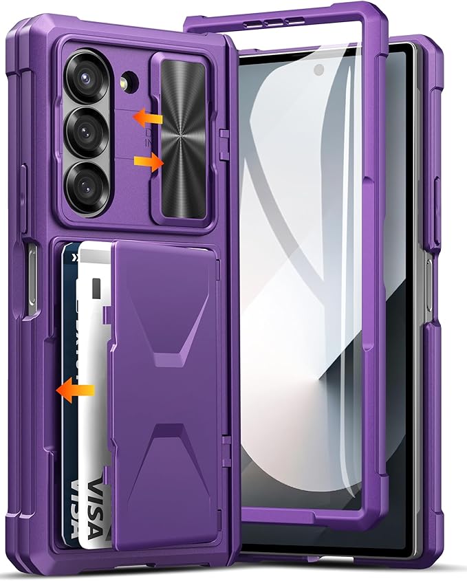 for Samsung Galaxy Z Fold 6 Wallet Case Built-in Card Holder & Slide Lens Cover & Tempered Screen Protector, Full Hinge Protection & Military Drop Protective Case for Samsung Z Fold6 5g, Purple