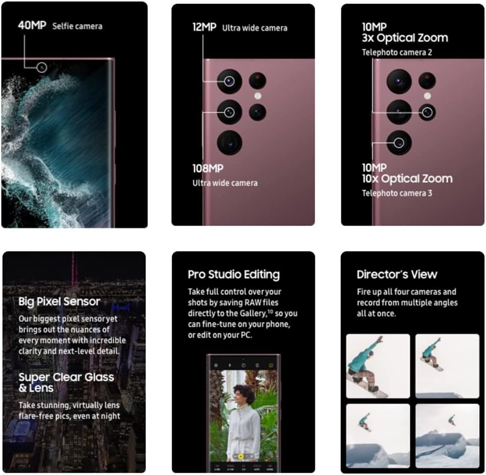Galaxy S22 Ultra: Feast your eyes on the Galaxy S22 Ultra. Slim silhouette. Gorgeous colors. Mirrored lens ring. A polished elegant frame. Oh. So. Beautiful. Ready. Steady. Action. The smoothest in the Galaxy, this Pro-grade Camera corrects shake better than ever for steady clarity in each frame. Super HDR adjusts your shots for epic details and hues — displaying 64x more color even in tricky shadows or back-lit shots. Ultra precise. Ultra sleek. The iconic S Pen fits right into S for the first time. Eject it from the bottom to take notes, sketch, edit content with precision or control your phone. Put pen to screen while using Samsung Notes and watch your handwriting turn into text. Go all day and supercharge your night Work, play and do your thing from one day into the next with a massive 5000mAh (typical) battery that intelligently saves power for when you need it most. Your favorite content. Our brighter screen. Take your must-see content to the next level on our brightest, smoothest adaptive 120Hz display with Vision Booster to optimize brightness and color contrast.