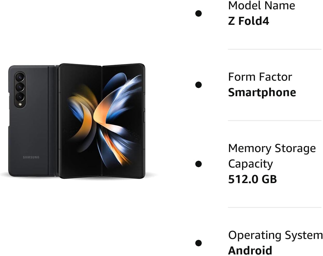 Unfold your world and achieve next level productivity with SAMSUNG Galaxy Z Fold4. This is the phone that holds its own so you can do two things at once. More screen means more doing. Launch multiple apps side by side with multi-window view. Maximize your viewing pleasure by unfolding your mobile phone into a tablet sized screen. It’s strong, sleek, and sturdy. Take on your day with the most reliable folding screen technology. Talk with friends while checking off your to-do list with hands- video chat. Use S Pen* on your Galaxy Z Fold4 with ease. Write out notes, sketch things out and get more done on the go. See your apps as big as they should be. With app display optimization, numerous apps naturally fit the edge-to-edge screen. Experience the continuity of having your Galaxy Z Fold4 and Galaxy Watch completely in sync. Fold up your Galaxy Z Fold4 and keep listening to what you love with connected Galaxy Buds. Enjoy an uninterrupted screen with an under-display selfie camera. *Compatible with S Pen Fold Edition and S Pen Pro only, sold separately. Works with main display only. **Drag and drop functionality works with select applications.
