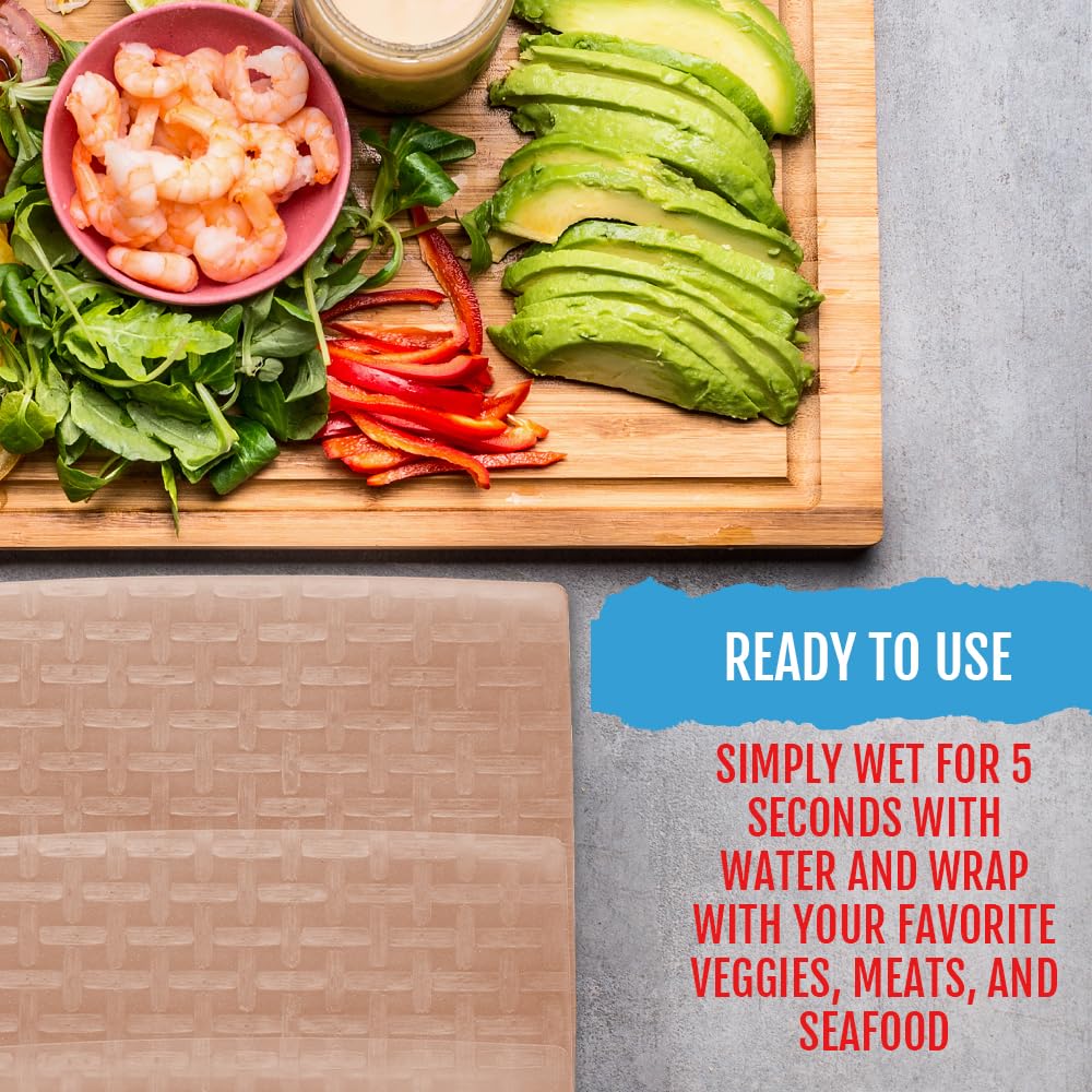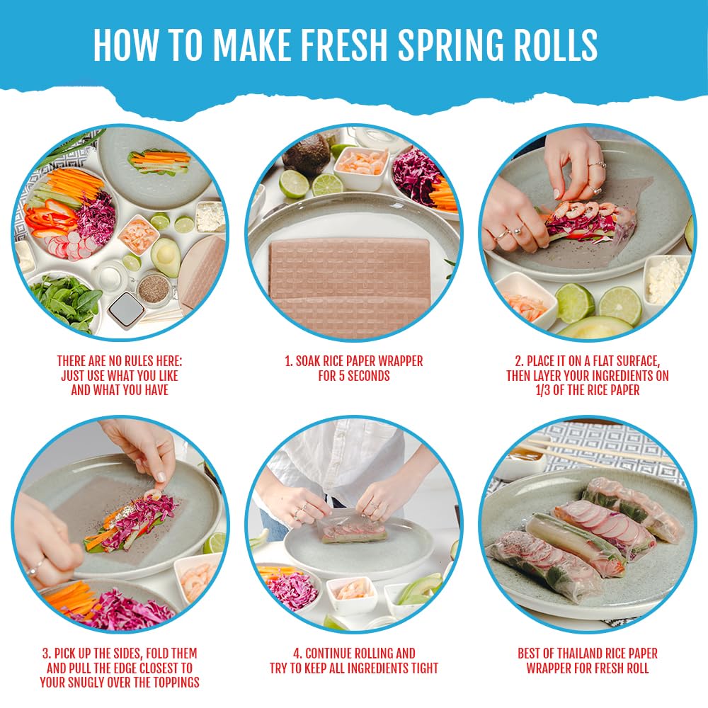 • HANDY, VERSATILE, & EASY TO USE: Make restaurant quality spring rolls at home with any ingredi-ents you have in your fridge. Simply dip sheet of rice paper in lukewarm water for 5 seconds then assemble your veggies, shrimp, chicken, or herbs until everything is nice wrapped.