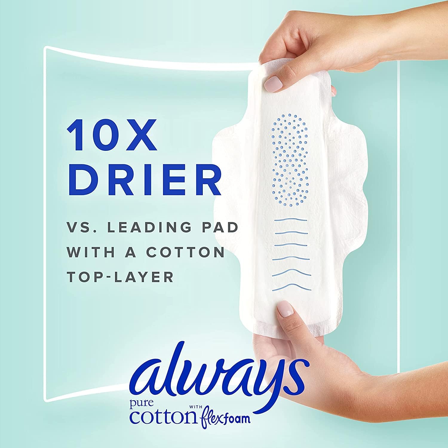 Try Always Pure Cotton Pads made with FlexFoam for up to Zero Leaks, Zero Feel protection. Discover the best of science and nature. Always Pure Cotton with FlexFoam pads combine a 100% pure cotton top layer with the breakthrough FlexFoam core, for incredible period protection that gives you peace of mind. Always Pure Cotton with FlexFoam pads are free of dyes, fragrances and chlorine bleaching. The pure cotton top layer is sourced from premium cotton that makes up less than 1% of the world's supply, meeting strict ingredient and processing requirements. You can feel 10X drier than the leading pad brand with a cotton top layer, so no feel and no fail protection is possible with Always Pure Cotton with FlexFoam pads! Are you getting the right protection from your pad? Using the wrong pad size can lead to leaks. Step up in size to help stop leaks. Now you can find your fit with Always® MY FIT, a tailored sizing system to help you find the best protection based on both your flow AND panty size. Use the sizing chart in the images to find your fit for day and night. Always Feminine Products are now HSA-/FSA-Eligible in the US.