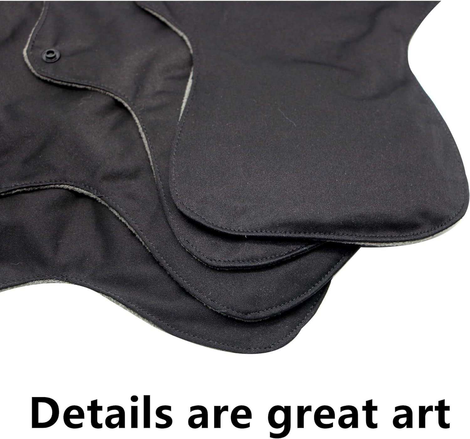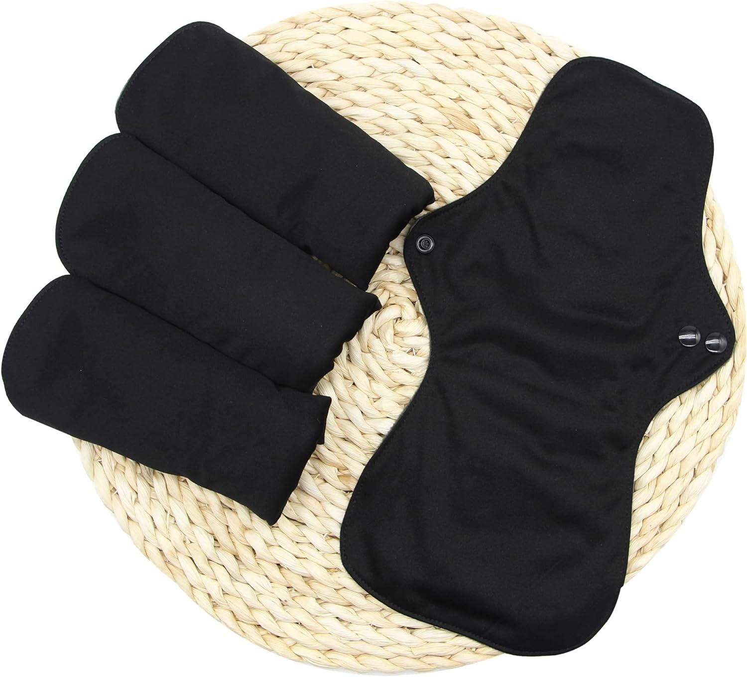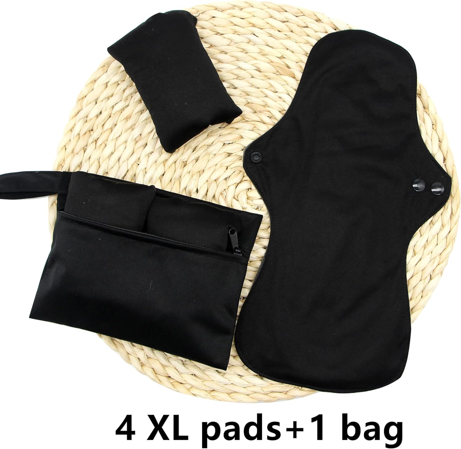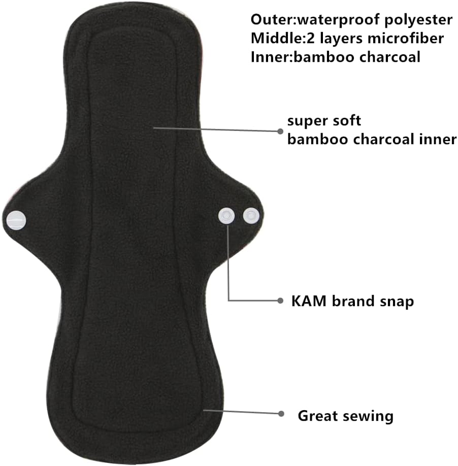 Plus size normal plusWashable sanitary towels with a length of 12 inches, suitable for women who need postpartum protection after giving birth and who have high intensity exercise and heavy menstrual flow Anti-leaksThere is a layer of PUL to prevent leakage and a pair of wings can tighten the undergarments to improve safety and firmness. Furthermore, the fan tail allows sanitary napkins to absorb more flow, avoiding leaks and allowing you to sleep comfortably Safety and hygienebamboo charcoal fiber: breathable, soft, fresh, comfortable, without harmful materials, fast absorption for a dry and comfortable feeling High efficiency water absorptionThe sanitary napkin consists of 4 layers: a bamboocharcoal layer, two inner layers of microfiber and a waterproof outer layer Economical and easy to washWashable sanitary napkins can be used repeatedly and machine washable in cold water
