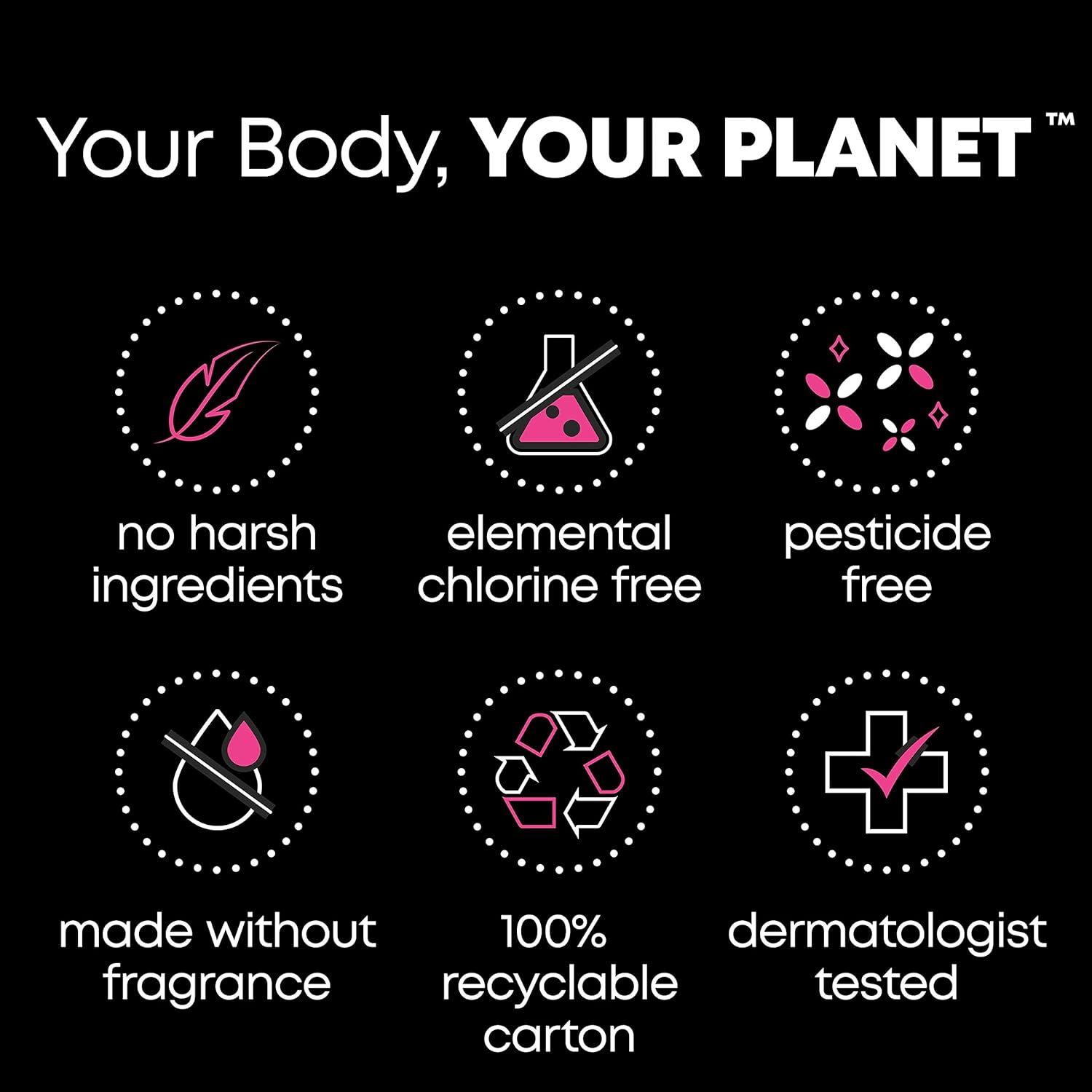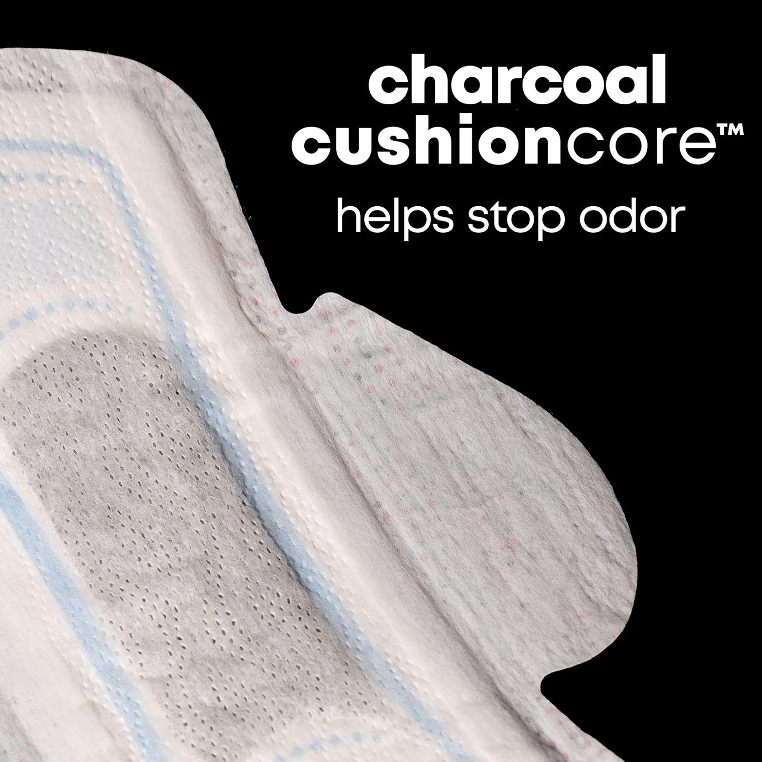 • Odor-Controlling Charcoal: U by Kotex's CushionCore is infused with 100% plant-based charcoal to help stop odor; sanitary pads are dermatologist-tested, made without fragrance, elemental chlorine free and pesticide free