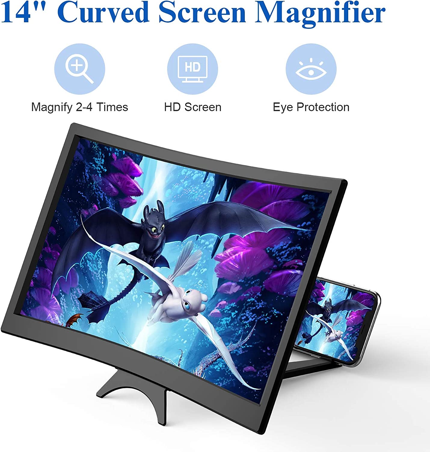 • 【14 Inch Curve Screen Magnifier】- 2020 new upgraded 14'' 3D curved screen amplifier can magnify your phone screen 2-4times, fully fit the curvature of the human eye, more comfortable to watch. The screen magnifier will reduce the discomfort and visual fatigue caused by long-term focus on the small screen, and can effectively reduce the radiation.
