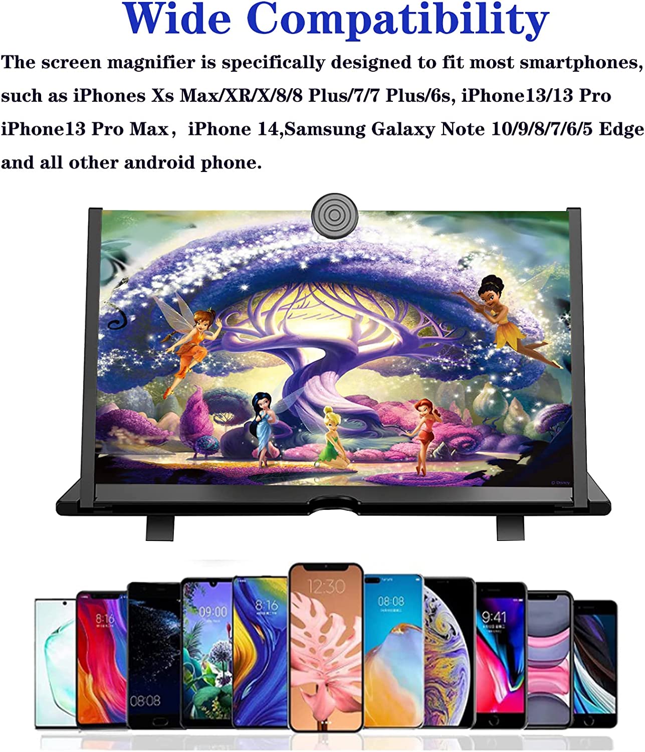 • 【Compatible With Your Device】- The screen magnifier is specifically designed to fit most smartphones,whether you have an iPhone or an Android phone. Such as iPhones 14Pro Max/13/12/12 mini / 11 pro max /11 / Xs Max/XR/X/8/8 Plus/7/7 Plus/6s Plus, Samsung Galaxy S10/Note 10/9/8/7/6/5 Edge