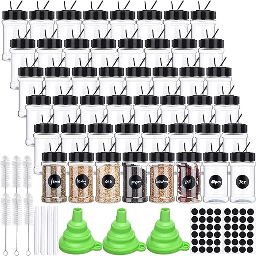 48 Pcs 7oz Clear Plastic Spice Jars Spice Bottles with Shaker Lids Plastic Seasoning Containers with Chalk Labels, Chalk Marker, Collapsible Funnel, Brush, Spice Storage Containers for Kitchen Cabinet