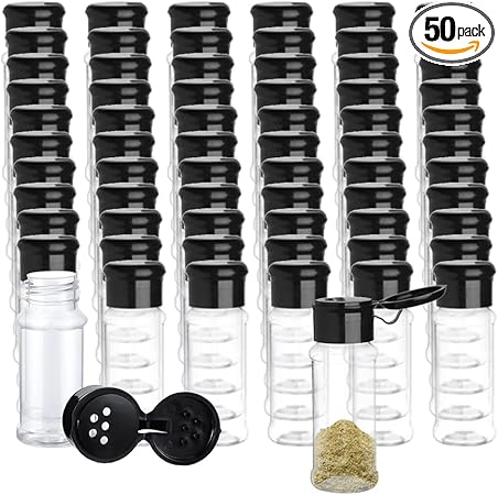 50 Pcs Spice Jars with Shaker Lids 3.3 oz/100 ml Plastic Spice Bottles Spice Containers Jars Seasoning Shaker for Storing Spice, Herbs and Seasoning Powders (Black Lid)