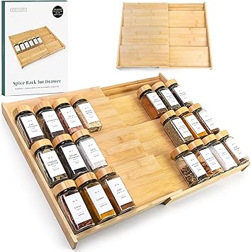 Bamboo Spice Drawer Organizer - Expandable 4 Tier Spice Rack (Need 3" Deep Drawer) 12" to 23" Wide, Seasoning Organizer, Organization Seasoning Rack insert for Kitchen Cabinet (Jars Not Included)
