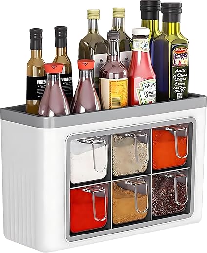 BREIS 6 Grids Clear Seasoning Box with Handle, Self Adhesive Wall Mounted Seasoning Containers, Seasoning Storage Container Rack with Removable Cruet Jars for Spice Salt Sugar