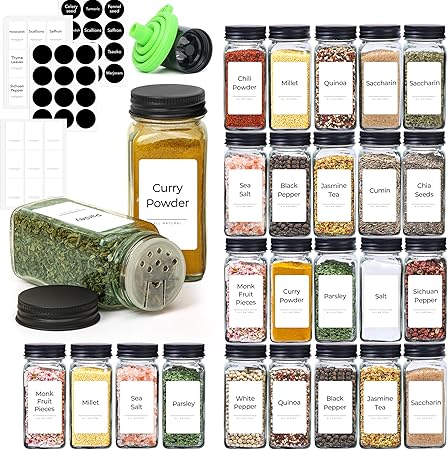 ComSaf 24Pcs 4oz Glass Spice Jars with Shaker Lids, 93 Labels, a Handy Funnel, a Pepper Grinder, Empty Spice Containers and Square Spice Bottles for Kitchen and Seasoning