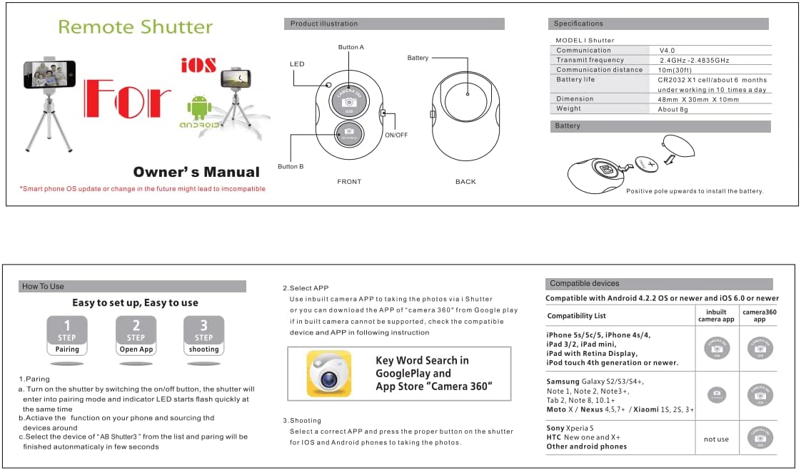 • The phone remote controller fits most andriod and ios system, with anti-lost strap. Comptable with: iphone 13 pro, 13 pro max, 12 11 X Xs 8, 7 Samsung, Google Pixel, Huawei, HTC...both Andriod and IOS