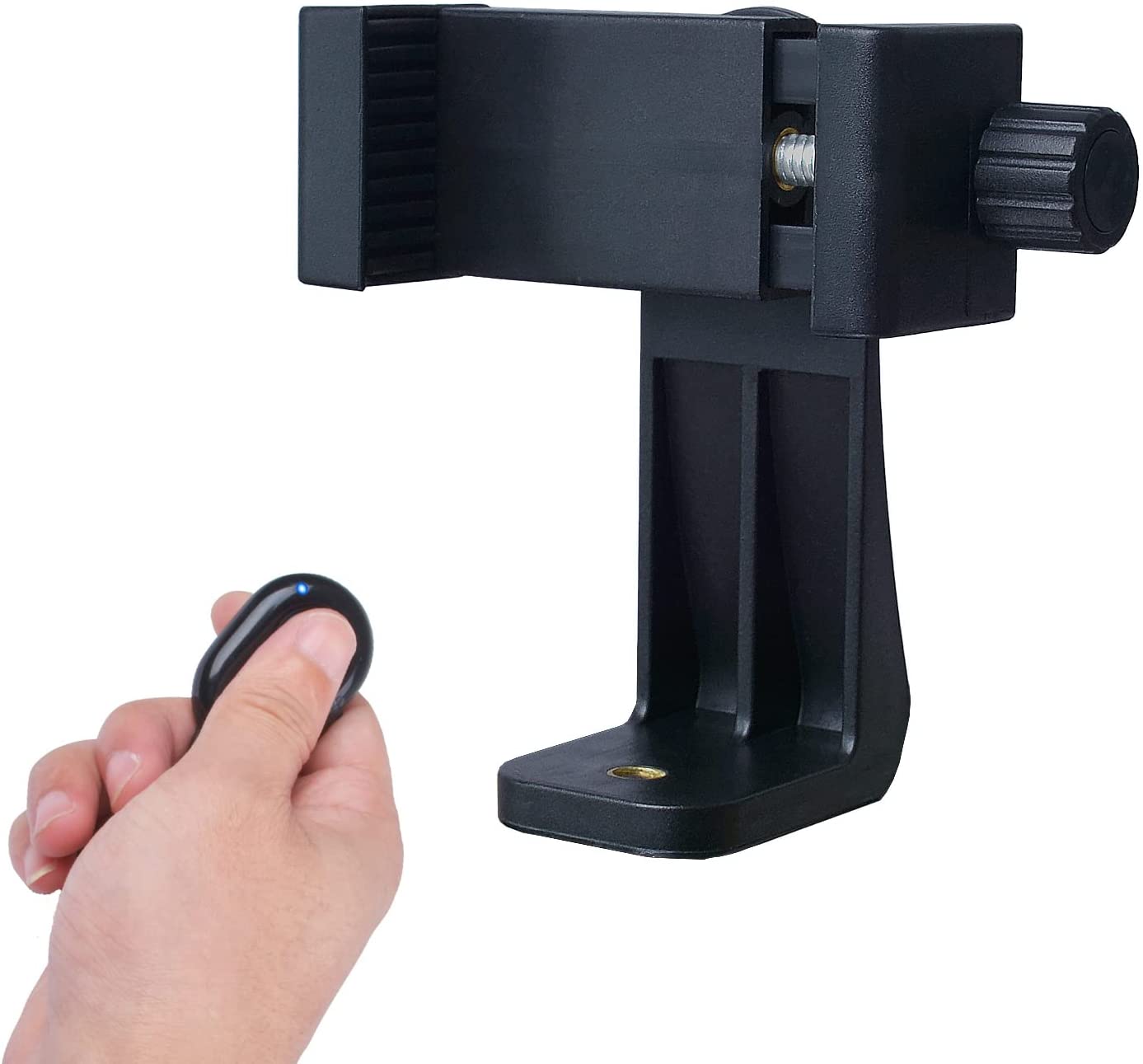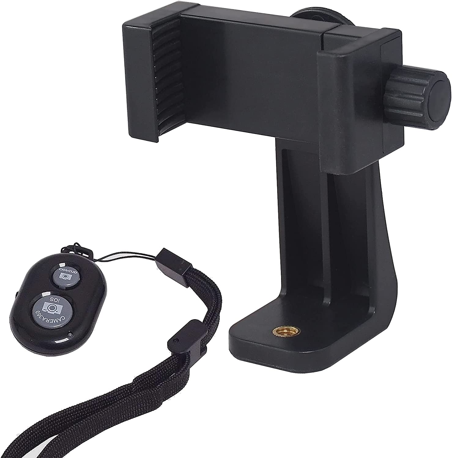 Phone Tripod Mount Adapter & Smartphone Remote Controller, Ruittos Smartphone Holder Clip Compatible with iPhone Samsung and All Cell Phones, Rotates Vertical Horizontal Adjustable Clamp