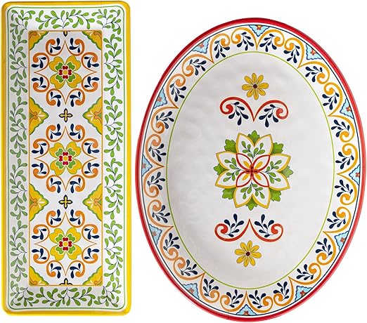 Melamine Serving Platter, Set of 2, Talavera Melamine Large Serving Tray, 19''x8'' Rectangular and 18''x14'' Oval Platter set. Multi-Color