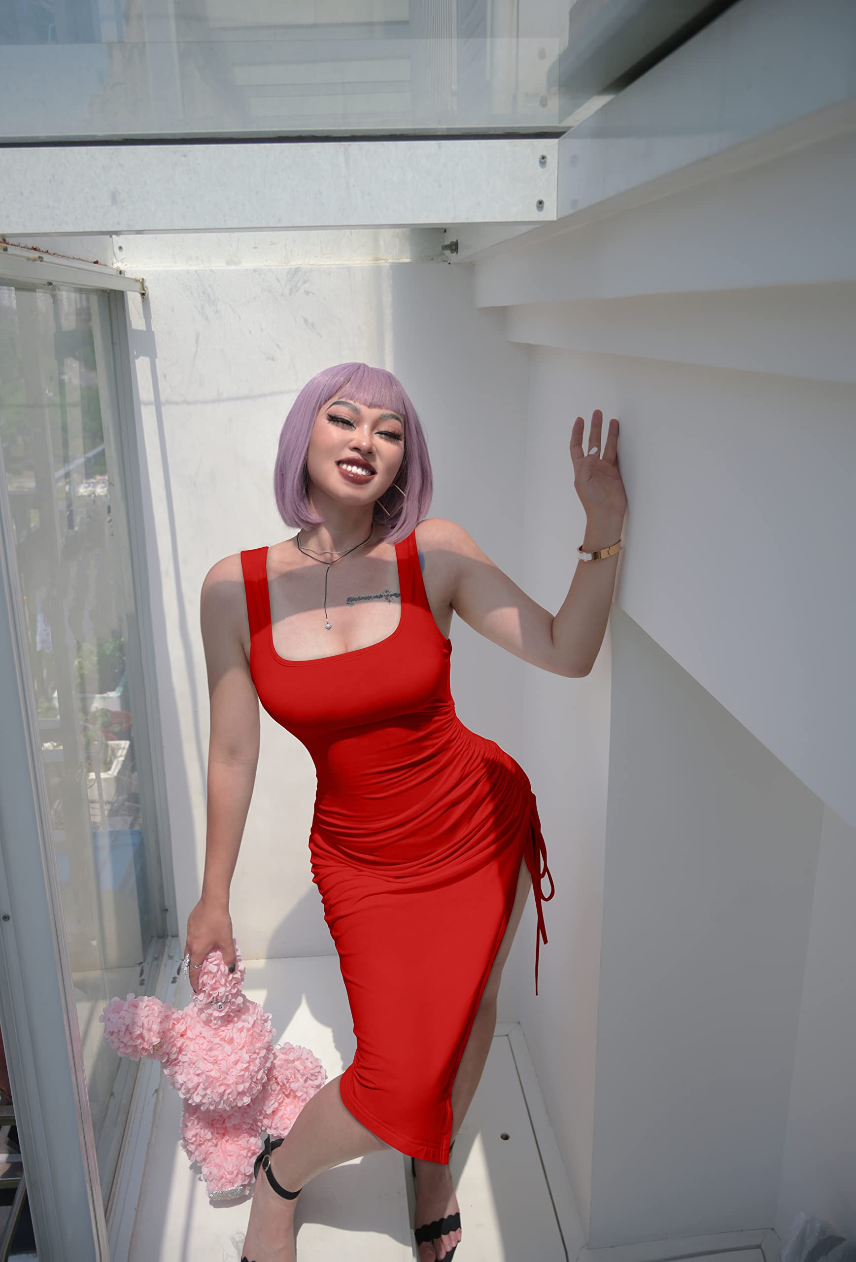 GOKATOSAU Women's Summer Sexy Sleeveless Side Split Bodycon Ruched Midi Tank Dress Red