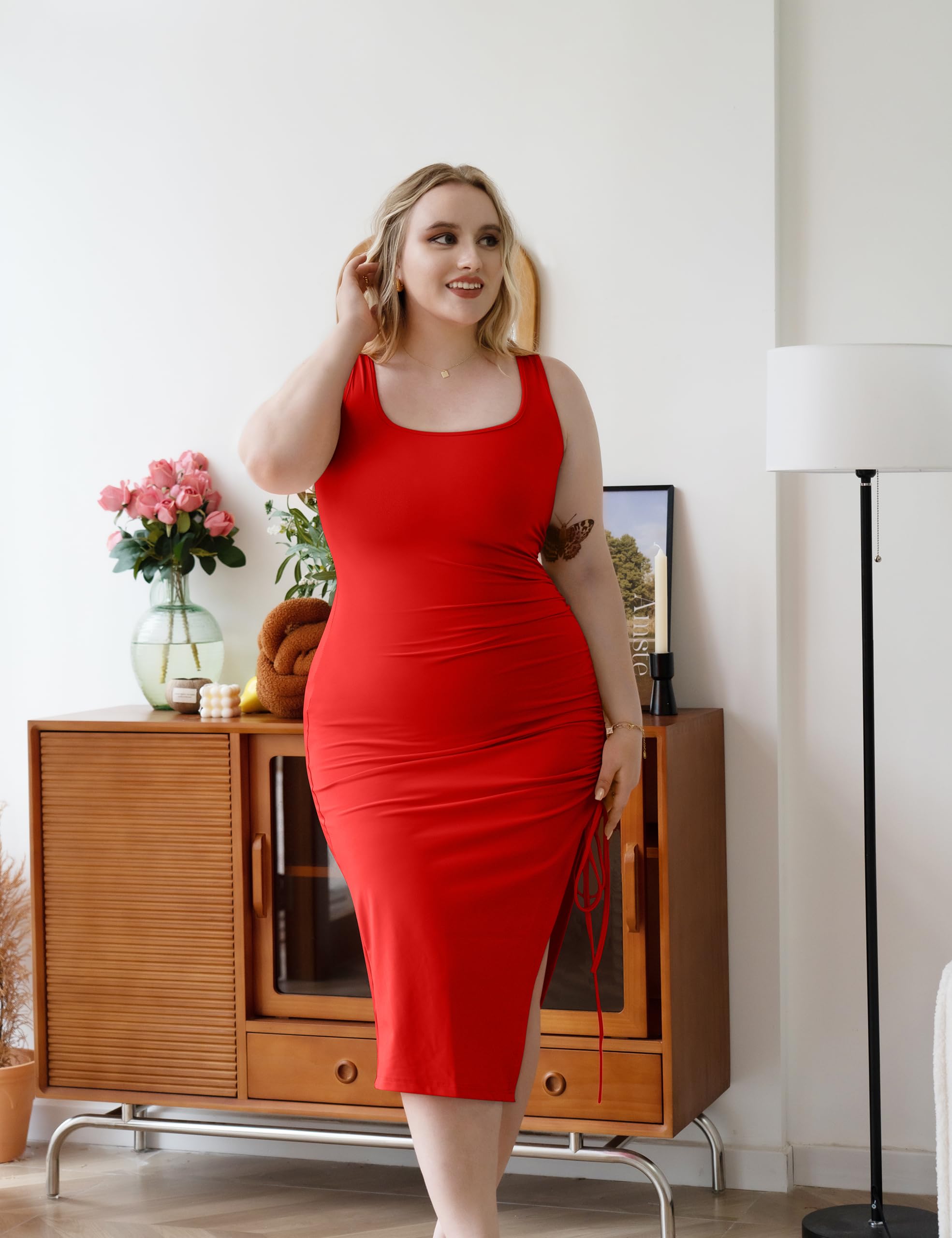 • Feature:Scoop neck side split sleeveless party midi dress, knee length, ruched and drawstring details at the side, hug your body perfectly and show your femininity.Very versatile, you can adjust the side slit to show more or less leg, but either way sexy.