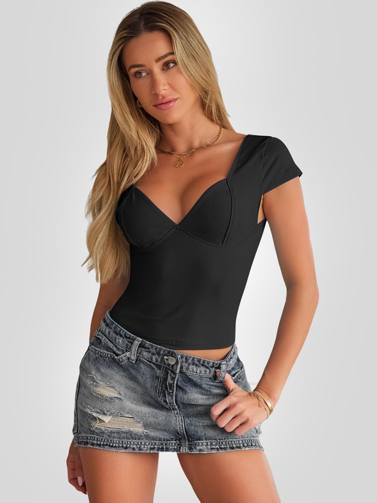 Trendy Queen Womens Going Out Tops Sexy Backless V Neck Short Sleeve T-Shirts Summer Tops 2024 Basic Cute Crop Tops Bustier Corset Cami Y2K Clothes Black