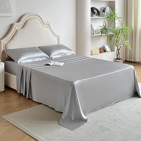 4 Pieces Silk Sheet Set, 100% Mulberry Silk Bed Sheets, 19 Momme Queen Size 6A Luxury Silk Bedding Set with Flat Sheet, Fitted Sheet & 2 Pillowcases (Queen, Grey)
