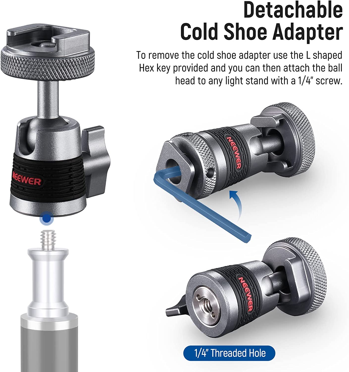 • 【Removable Cold Shoe Base】 The cold shoe can secure to a DSLR camera, a mirrorless camera, or a camcorder via the knurled thumbscrew and the L shaped hex key. Remove it with another hex key and use the 1/4" threaded hole for connecting to a light stand or desk tripod