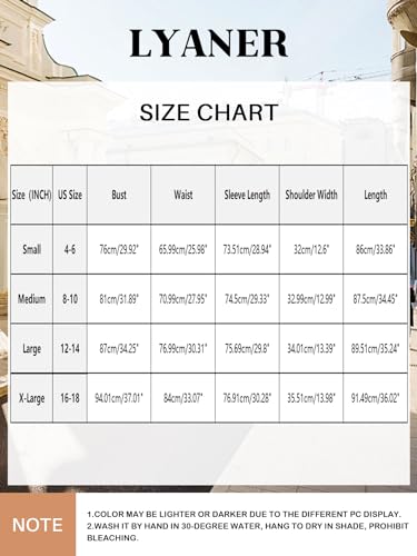 Large: Length: 89.5 cm/35.25", Waist: 77 cm/30.25", Bust: 87 cm/34.25", Sleeve: 75.5 cm/29.75", Shoulder: 34 cm/13.5",