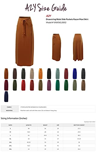 Details: (YAWSKL0001) Relaxed fit / Maxi Skirt / Fold-able Waistband (YAWSKL0002) Relaxed fit / Maxi Skirt / Drawstring Waist MEASUREMENTS (Inches) YAWSKL0001 S - Length : 43 / Waist : 24 / Hip : 28 / Bottom Sweep : 27.5 M - Length : 43.5 / Waist : 26 / Hip : 30 / Bottom Sweep : 28 L - Length : 44.5 / Waist : 27.5 / Hip : 32 / Bottom Sweep : 29.5 XL - Length : 45 / Waist : 29 / Hip : 34 / Bottom Sweep : 31 1XL - Length : 45.5 / Waist : 32 / Hip : 37 / Bottom Sweep : 32 2XL - Length : 46 / Waist : 34 / Hip : 40 / Bottom Sweep : 33 3XL - Length : 47 / Waist : 37 / Hip : 42 / Bottom Sweep : 34.5 YAWSKL0002 S - Length : 40 / Waist : 26 / Hip : 29 / Bottom Sweep : 27.5 M - Length : 40.5 / Waist : 28 / Hip : 32 / Bottom Sweep : 29.5 L - Length : 41 / Waist : 29.5 / Hip : 35 / Bottom Sweep : 30.5 XL - Length : 42 / Waist : 31 / Hip : 37 / Bottom Sweep : 31.25 1XL - Length : 42.25 / Waist : 33 / Hip : 39 / Bottom Sweep : 32 2XL - Length : 42.5 / Waist : 36 / Hip : 41 / Bottom Sweep : 33 3XL - Length : 43 / Waist : 39 / Hip : 43 / Bottom Sweep : 34.5