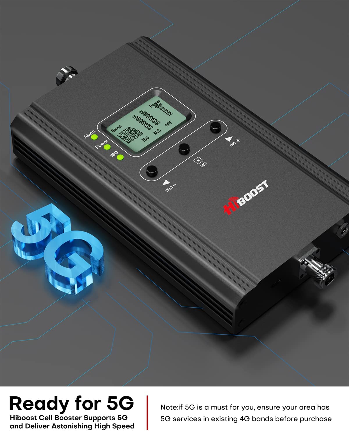 • 📶 【𝟓𝐆 𝐂𝐨𝐦𝐩𝐚𝐭𝐢𝐛𝐥𝐞】HiBoost cell booster supports 5G and deliver astonishing high speed; Support 5G only that’s largely deployed in existing 4G bands by DSS (Dynamic Spectrum Sharing) by carriers; New mmWave bands and T-Mobile 600MHz cellular boosters are not permitted by FCC yet; 𝙉𝙤𝙩𝙚:So if 5G is a must for you, ensure your area has 5G services in existing 4G bands before purchase.Some of the packaging still uses 4G packaging, but booster actually supports 5G in the 4G bands.