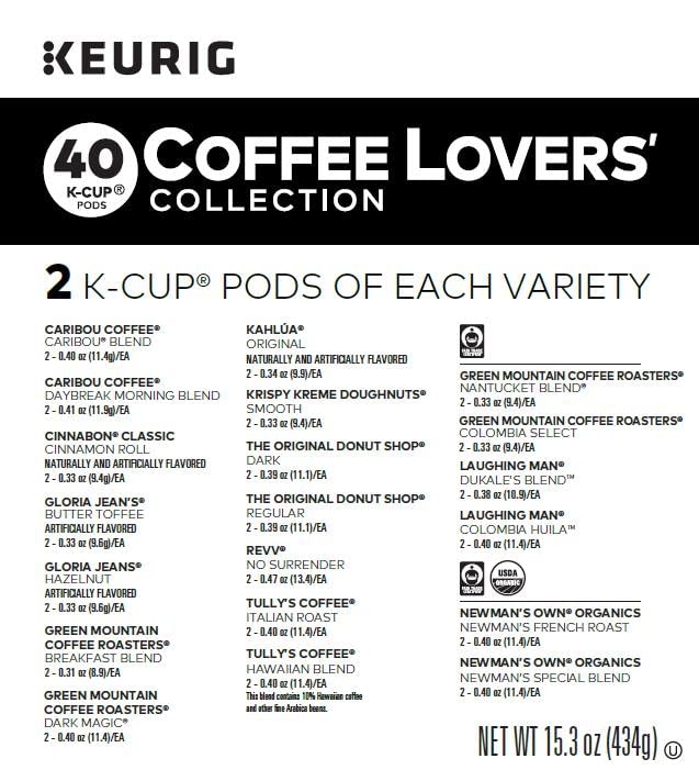 Explore a wonderful assortment of coffee and discover your favorites with the Keurig 40ct. Coffee Lovers’ Collection. Loaded with delicious possibilities and curated just for you, the coffee lover, this collection includes 40 K-Cup pods spanning 20 different varieties from 11 of your favorite brands, including Green Mountain Coffee, The Original Donut Shop, Newman’s Own Organics, Tully’s, Caribou Coffee, and more. Sample from an impressive range of light, medium, and dark roasts, plus Fair Trade, organic, and flavored coffee too. Try something unexpected, or choose from some of our most popular varieties, like Green Mountain Coffee Nantucket Blend, The Original Donut Shop Regular, Tully’s Hawaiian Blend, and Krispy Kreme Smooth. The K-Cup pods inside the Keurig Coffee Lovers’ Collection are designed to work with any Keurig K-Cup coffee maker; just pop one in and enjoy delicious, fresh-brewed coffee in no time at all – with just the touch of a button. Introducing Recyclable K-Cup Pods: Simple. Delicious. And now Recyclable. Enjoy the same great-tasting coffee you know and love, and when you’re done just peel, empty and recycle. Check locally, not recycled in all communities. Packaging may vary.