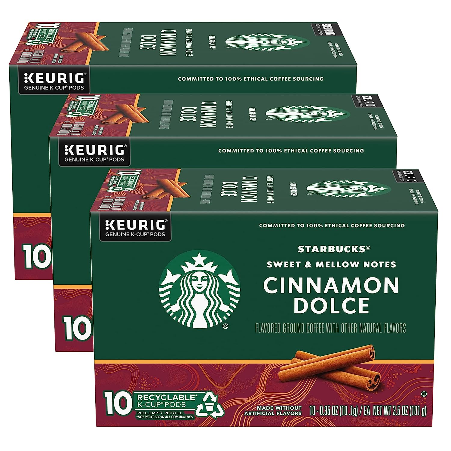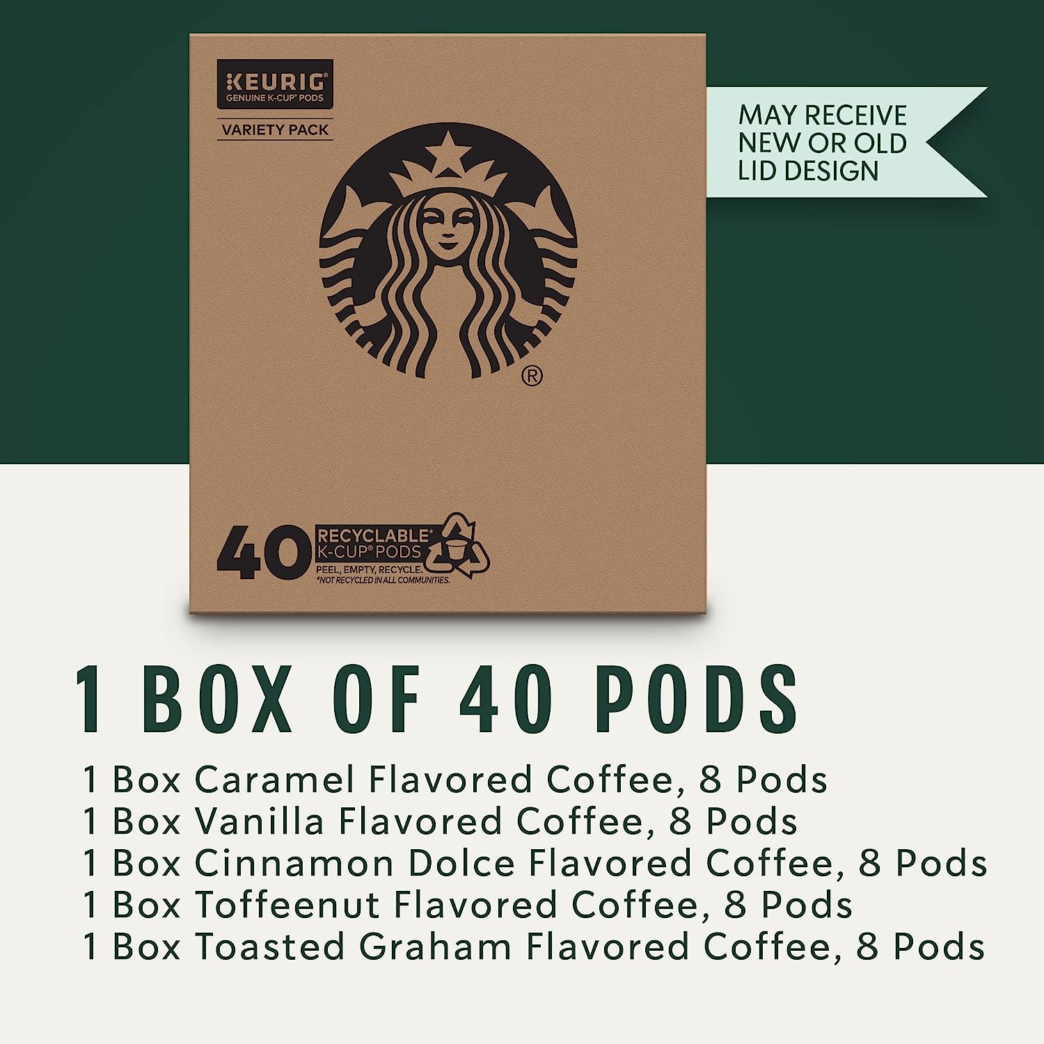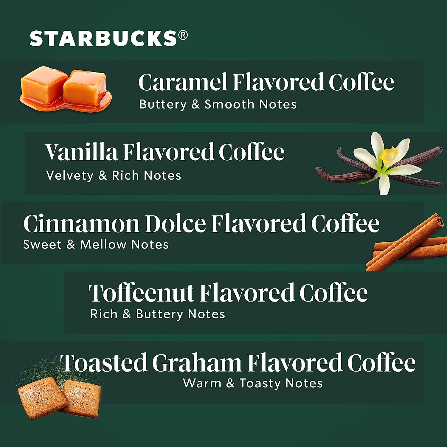 Explore five of our most popular coffees: Starbucks Caramel Favored Coffee is buttery and smooth; Starbucks Vanilla Favored Coffee is velvety and rich; Starbucks Cinnamon Dolce Favored Coffee is sweet and mellow; Starbucks Toffeenut Favored Coffee is rich and buttery; and Starbucks Toasted Graham Favored Coffee is warm and toasty. The Starbucks Favored Coffee variety pack lets you find a roast that fits your mood and palate. Nestlé uses Starbucks trademarks under license