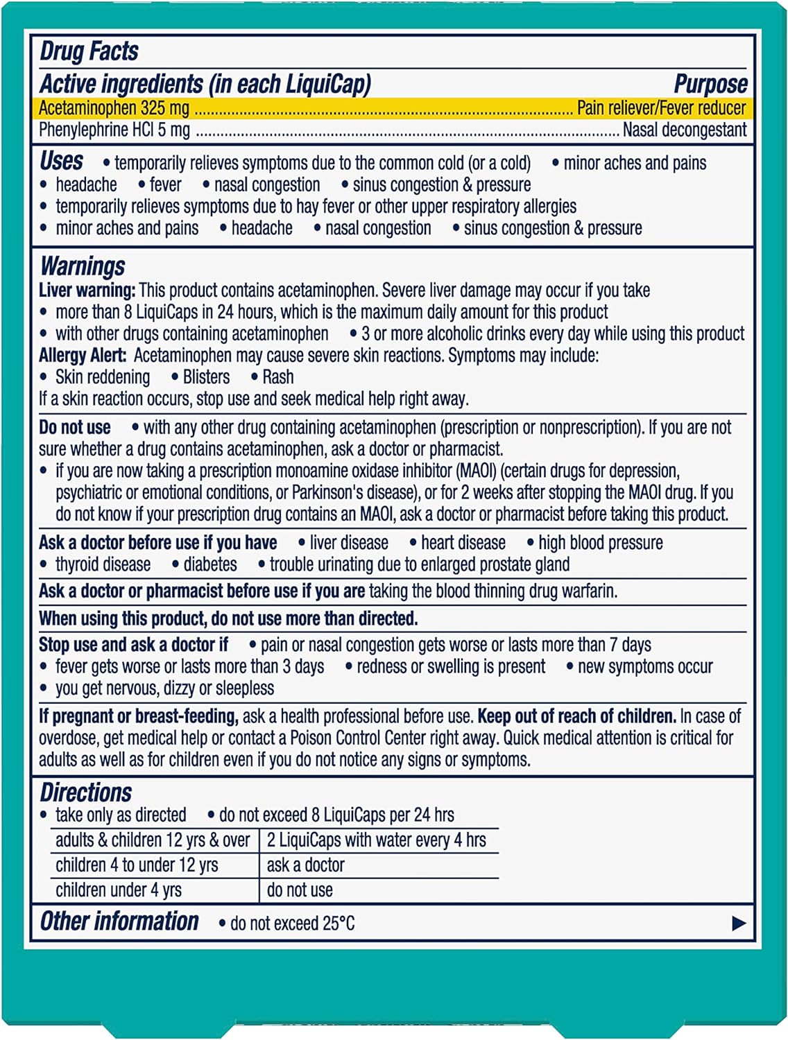 The Power of Vicks - the world’s #1 selling cough and cold brand! Get fast, powerful non-drowsy relief from nasal congestion, sinus pressure, sinus headache, and sinus pain! Helps to relieve bothersome sinus symptoms by reducing swelling in the sinuses and providing pain relief. This product is best suited for treating sinus symptoms caused by a cold or seasonal allergy spell. Temporarily relieves symptoms due to the common cold, hay fever, or other upper respiratory allergies. The LiquiCaps work in as little as 30 minutes for fast relief, day or night! For adults and children 12 years and older (with adult supervision): take 2 LiquiCaps with water every 4 hours, do not exceed 8 LiquiCaps in a 24 hour time period. For children between age 4 and 11, ask a doctor. Do not use with children under 4 years of age. Read each label and use only as directed. Call your doctor if you suspect a sinus infection or sinusitus.