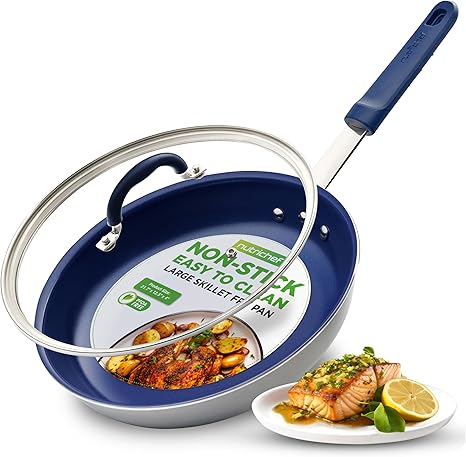 NutriChef 12" Fry Pan With Lid - Large Skillet Nonstick Frying Pan with Silicone Handle, Ceramic Coating, Blue Silicone Handle, Stain-Resistant, Easy To Clean, Professional Home Cookware