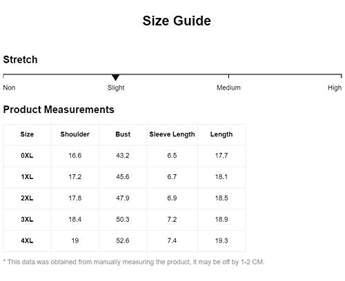 Details: Size Chart: Large Plus: Shoulder:16.6", Bust:43.2", Sleeve Length:6.5", Length:17.7" X-Large Plus: Shoulder:17.2", Bust:45.6", Sleeve Length:6.7", Length:18.1" XX-Large Plus: Shoulder:17.8", Bust:47.9", Sleeve Length:6.9", Length:18.5" 3X-Large Plus: Shoulder:18.4", Bust:50.3", Sleeve Length:7.2", Length:18.9" 4X-Large Plus: Shoulder:19", Bust:52.6", Sleeve Length:7.4", Length:19.3"