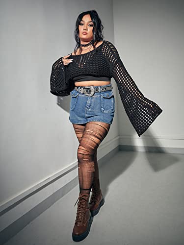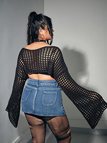 Floerns Women's Plus Size Boat Neck Long Sleeve Hollow Out Crochet Cropped Sweater Black 2XL
