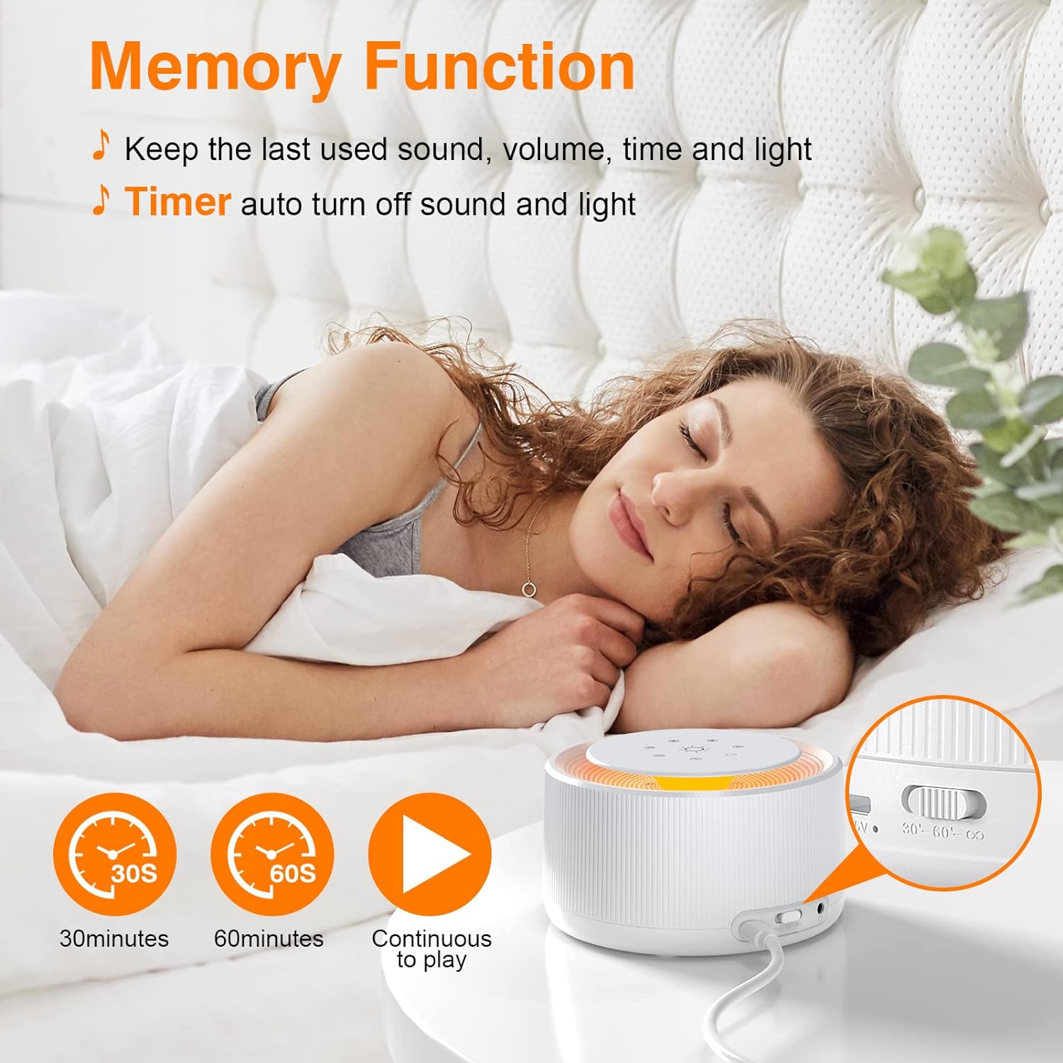 • 【3 Timers and Memory Function】: White noise machine for adults sleeping can be set to play continuously all night or 30,60 minutes with automatic shutdown timer, which you can adjust it on the back of the sleep machine. As the timer closes, the sound fades out and then turns off. In addition, the white noise machine has a memory function and a headphone jack, it automatically restores the volume, sound and timer settings from the last time it was used, so you don't need to readjust.
