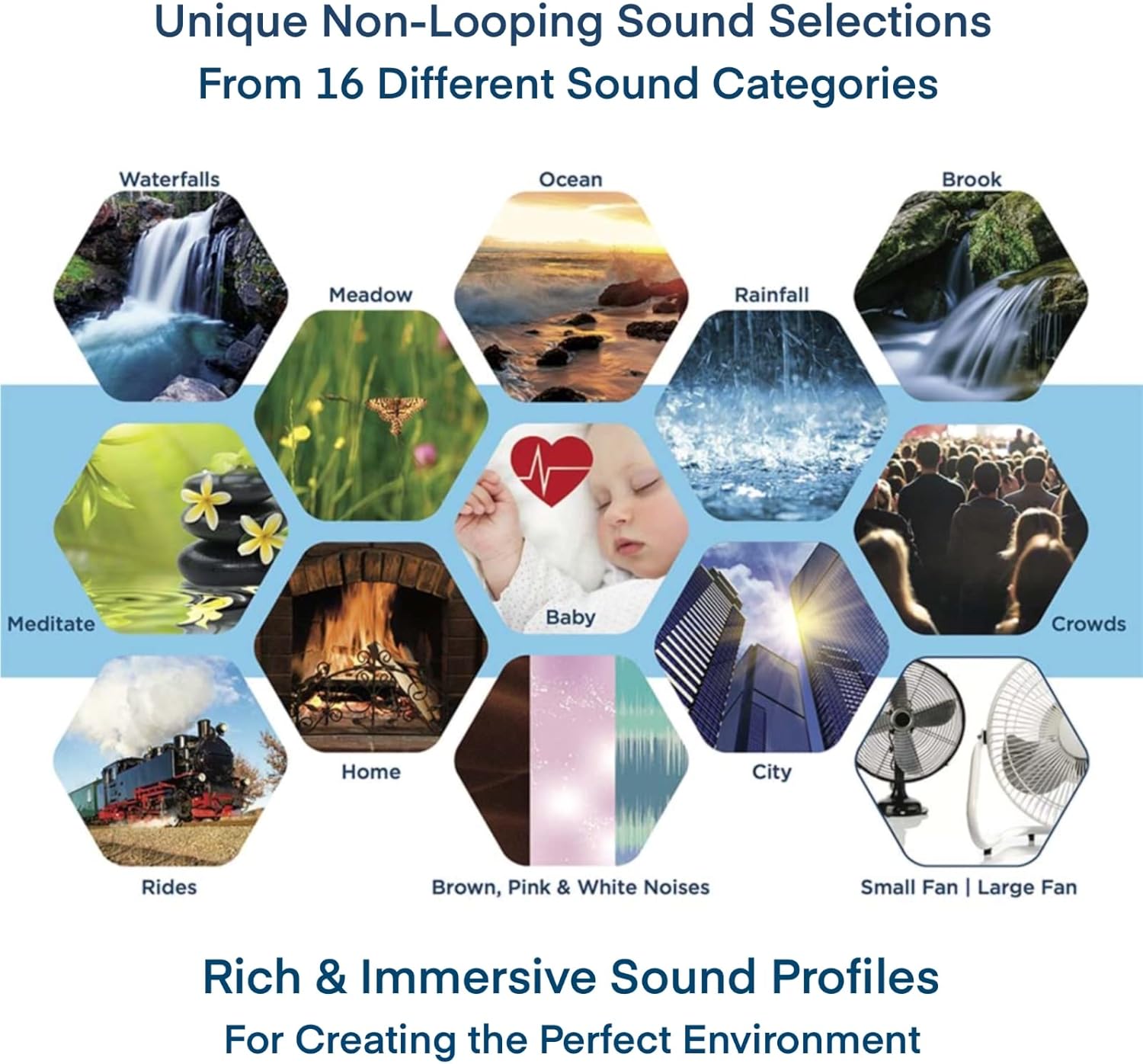 SOUND+SLEEP Choose from 10 distinct sound profiles, each with three levels of richness to total 30 different sound profiles, all of which have been scientifically engineered to promote a deeper sleep, relaxation, and renewal. Unlike other “white noise” sound machines, SOUND+SLEEP uses magnificent, naturally recorded, high-definition sounds that are up to 30 minutes in length, eliminating all audio repetition for natural real-world sound environments.