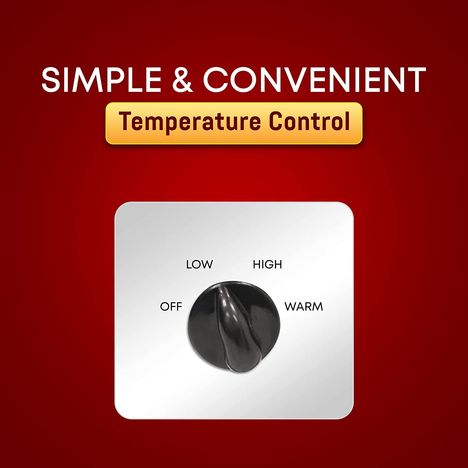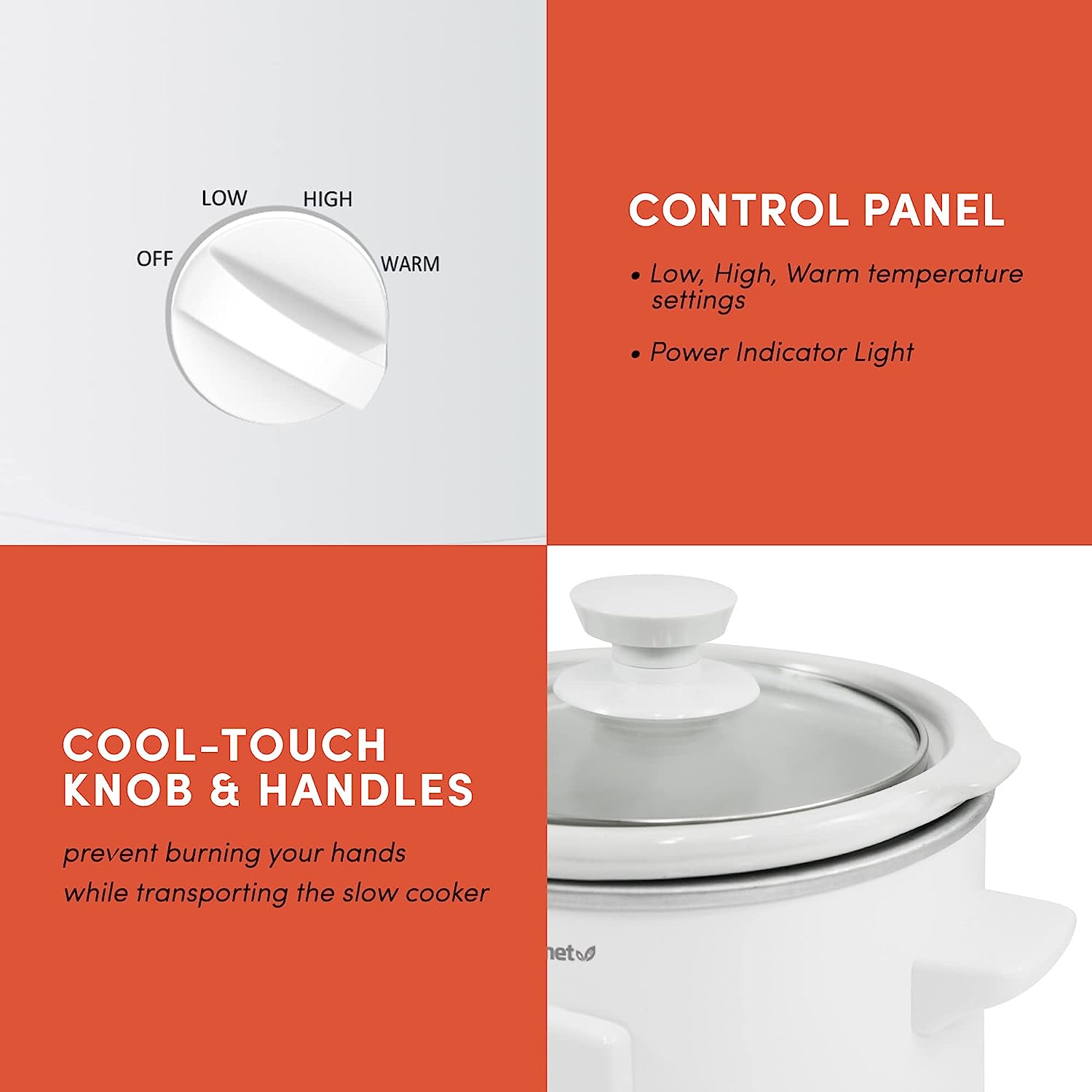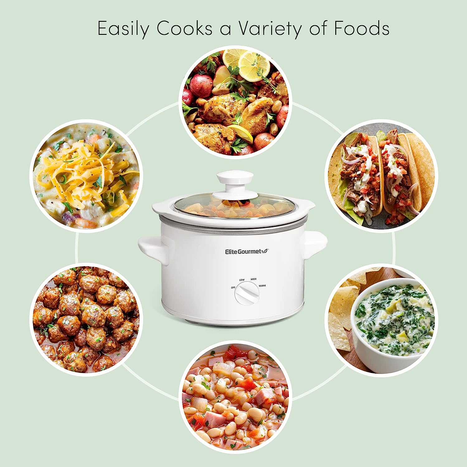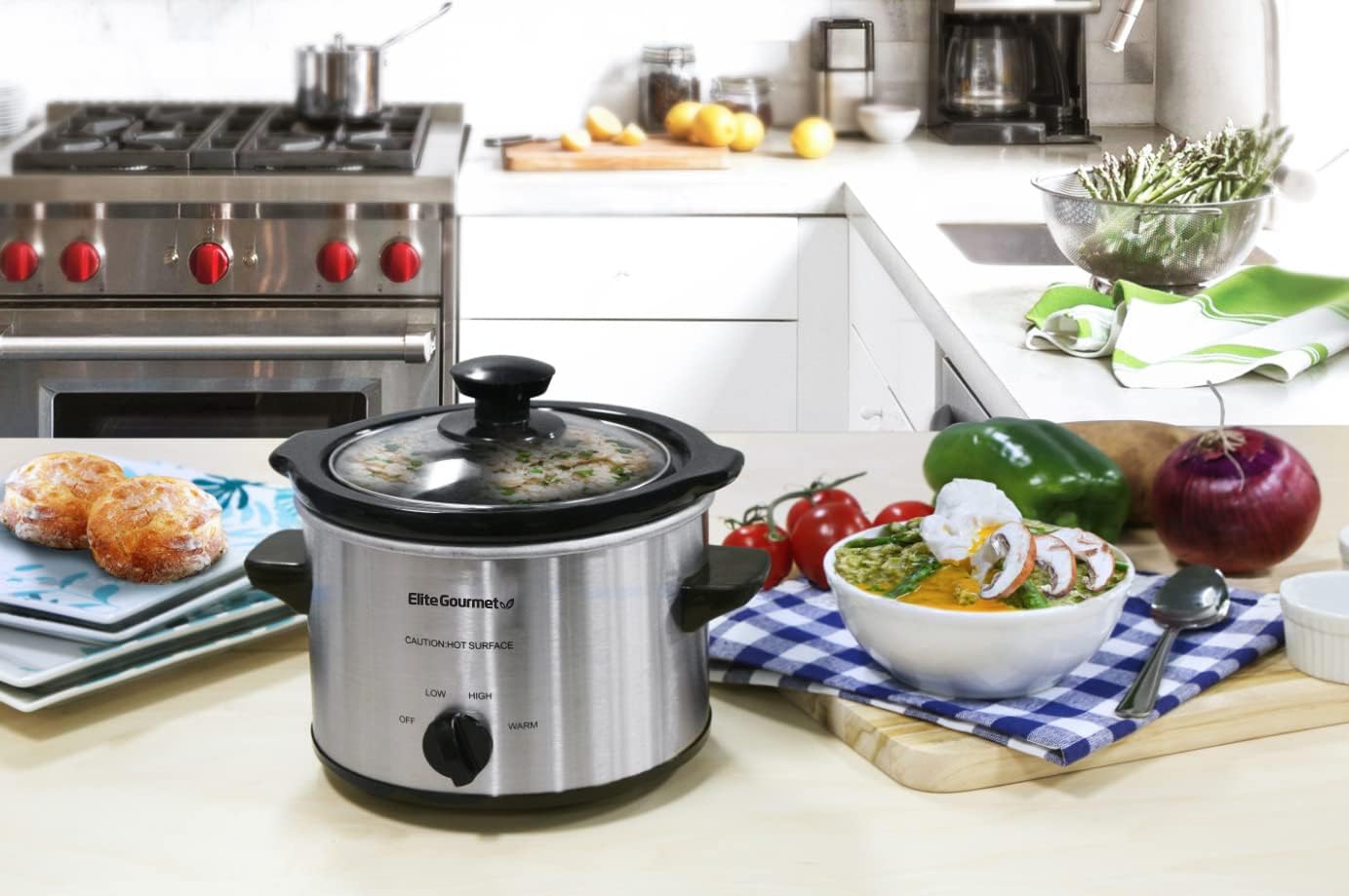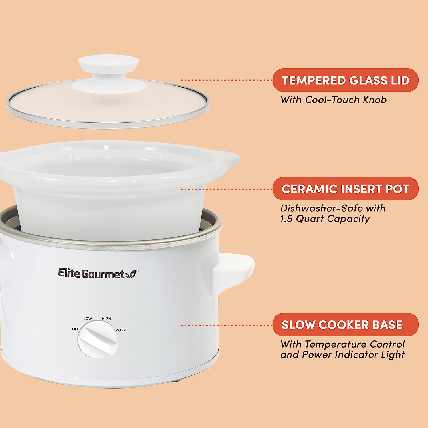 The Elite Gourmet 1.5 Qt. Mini Slow Cooker is perfect for cooking and serving small one-pot meals and appetizers such as soups, stews, meatballs, dips, and sauces. It's a great kickoff for a fondue party or where everyone prepares their favorite dip in their 1.5 Qt. Mini Slow Cooker. This versatile small appliance can be a single person's best companion as well as the all-star at your next Super Bowl party. It features low and high temperature settings, a keep-warm setting allowing you to keep your meal hot and fresh before it’s served, and an attractive stainless steel finish. It includes a removable inner stoneware pot that’s easy to clean, with a tempered glass lid with metal rim for easy viewing of cooking cycle and cool-touch handles and knob for safe handling.