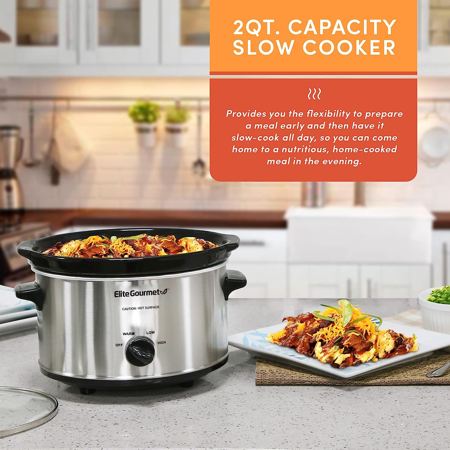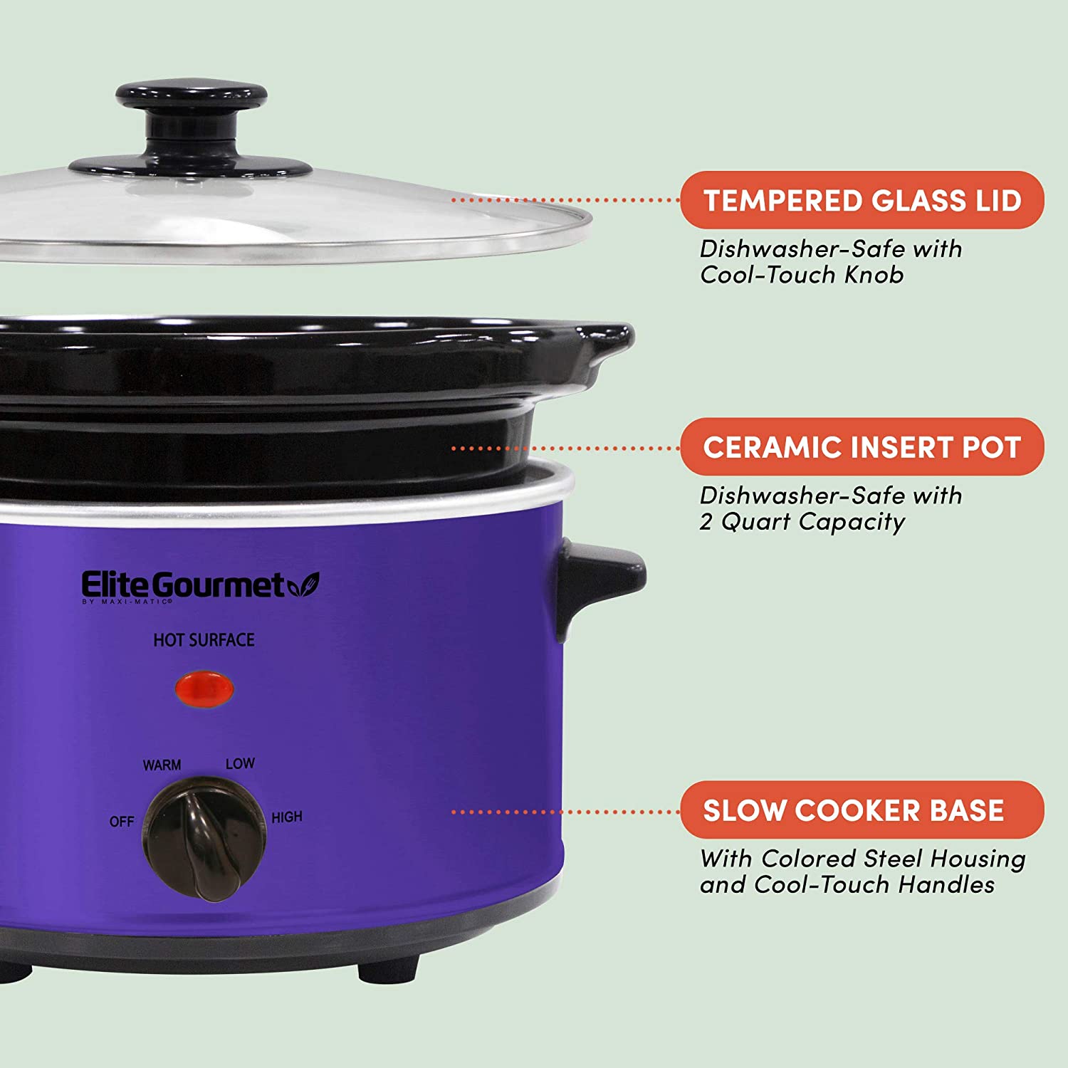 The Elite Gourmet 2 Quart Slow Cooker is the perfect appliance for cooking and serving meals for a small family. It features defrost, low and high temperature settings perfect for making chili's, stews, sauces and even a 2 lb. chicken or roast and, with an attractive red stainless steel finish, it's the perfect addition to any kitchen! It includes a removable inner stoneware pot that's easy to clean, a tempered glass lid with metal rim for easy viewing and cool-touch handles and knob for safe handling.