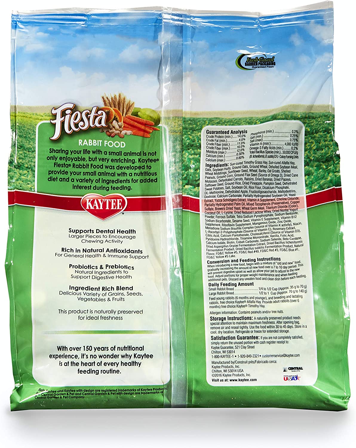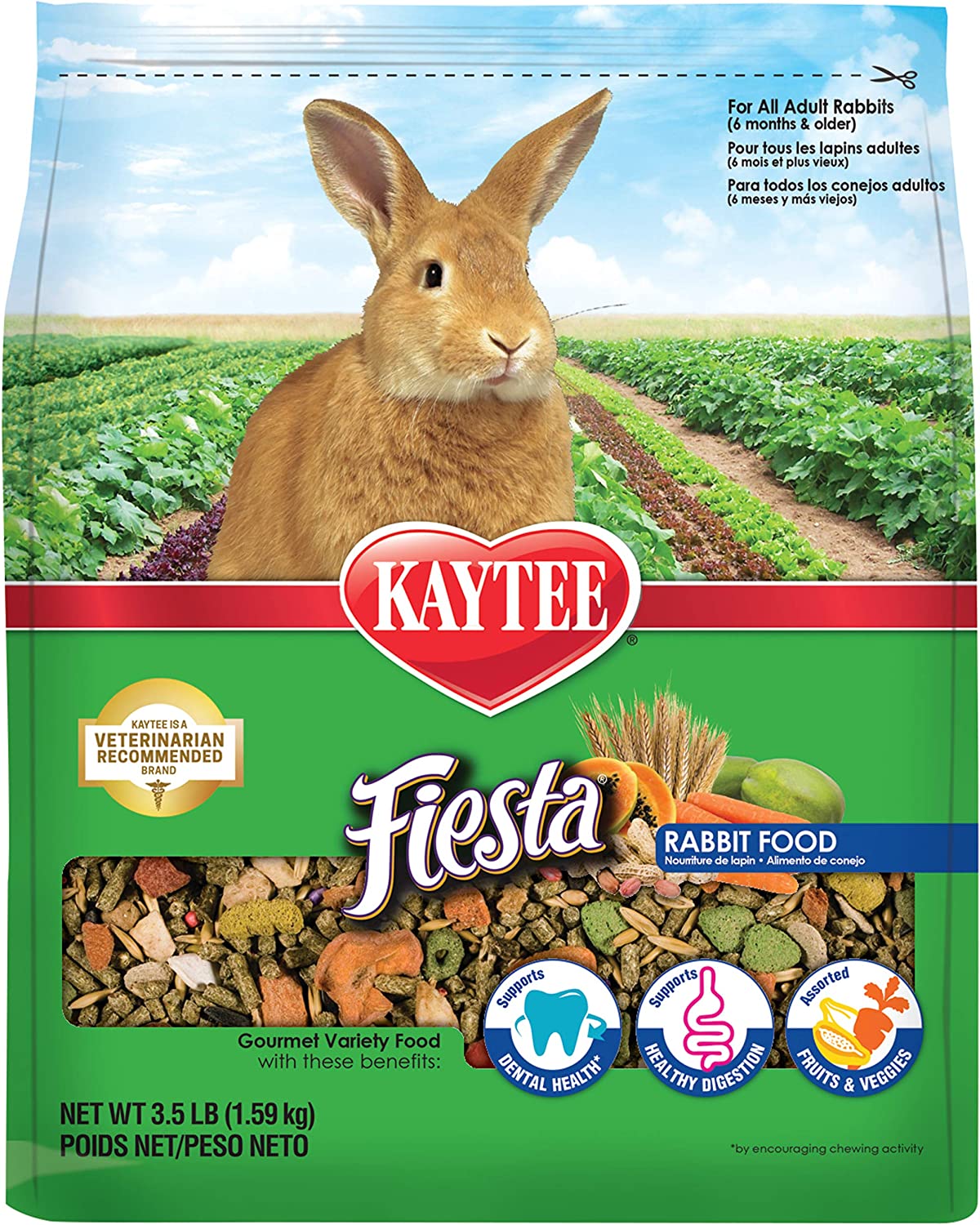 Kaytee Fiesta Rabbit food is a nutritionally fortified gourmet diet made of a premium blend of fruits, vegetables, seeds and grains offering maximum variety, fun and nutrition for small animals. Fiesta contains prebiotics and probiotics to support digestive health and is formulated with your small animal species in mind.