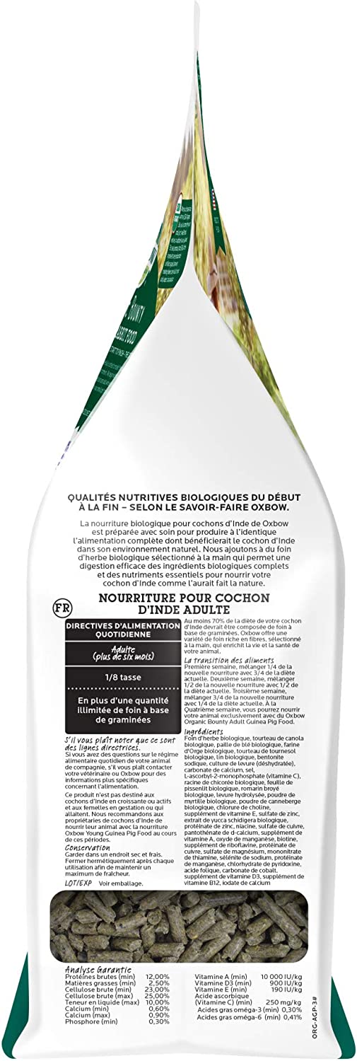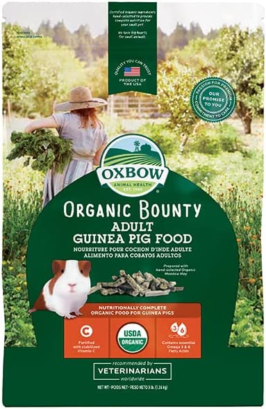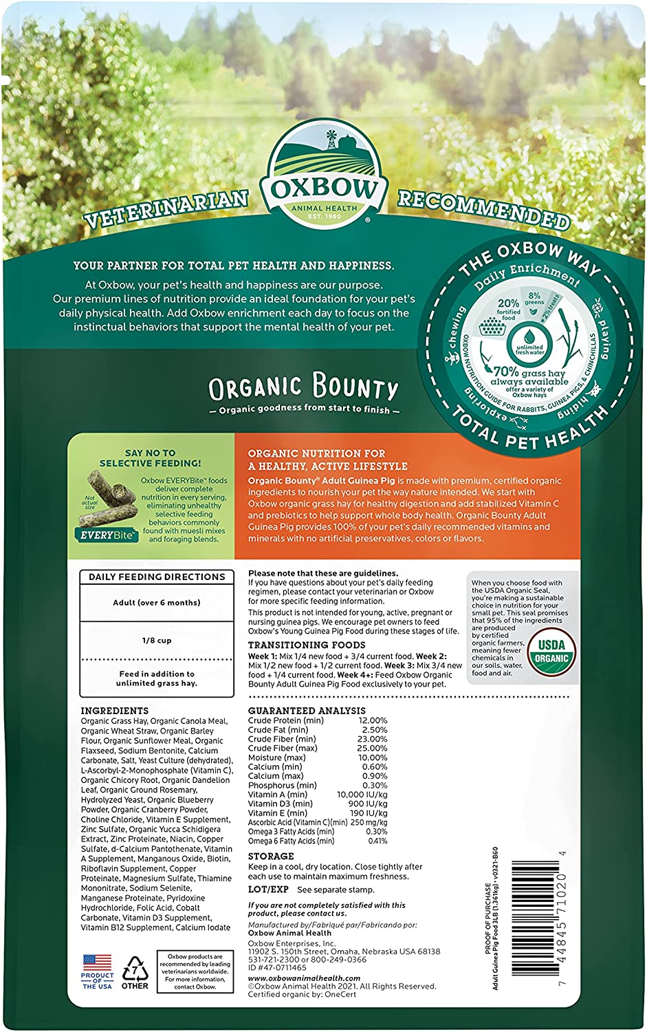 At Oxbow Animal Health, our purpose is to help people and pets live happy, healthy lives. For more than 30 years, we’ve partnered with leading veterinarians and nutritionists to develop nutrition and care products that meet the specific species and life stage needs of rabbits, guinea pigs, chinchillas, hamsters, gerbils, rats, and mice. From farm fresh hays and nourishing fortified foods to wholesome treats, beneficial supplements, enrichment and care, Oxbow products are used and recommended by leading veterinary professionals and passionate pet parents worldwide. Oxbow’s Organic Bounty Adult Guinea Pig food is carefully crafted to model the complete nutrition a guinea pig would find in its natural environment. We begin with hand-selected organic grass hay to promote effective digestion and add wholesome, organic ingredients and vital nutrients to nourish your small pet the way nature intended. FEEDING INSTRUCTIONS: Feed 1/8 cup daily in addition to unlimited grass hay to guinea pigs over the age of 6 months. This product is not intended for growing, active, pregnant or nursing guinea pigs. We encourage pet owners to feed Oxbow Essentials Young Guinea Pig Food during these stages of life. Please note that these are guidelines.