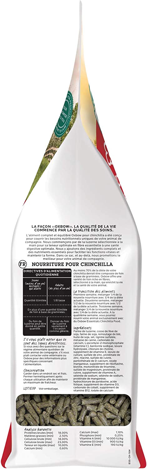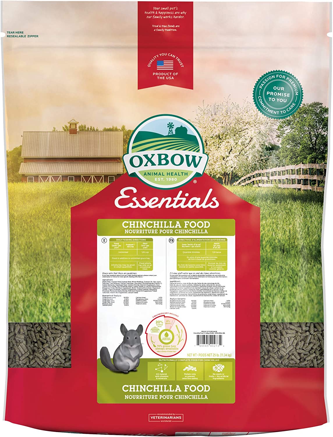 At Oxbow Animal Health, our purpose is to help people and pets live happy, healthy lives. For more than 30 years, we’ve partnered with leading veterinarians and nutritionists to develop nutrition and care products that meet the specific species and life stage needs of rabbits, guinea pigs, chinchillas, hamsters, gerbils, rats, and mice. From farm fresh hays and nourishing fortified foods to wholesome treats, beneficial supplements, enrichment and care, Oxbow products are used and recommended by leading veterinary professionals and passionate pet parents worldwide. Oxbow’s Essentials - Chinchilla Food is formulated to meet the specific nutritional needs of chinchillas of all ages. This complete and balanced chinchilla food contains Alfalfa hay to provide optimal energy and the fiber essential for healthy digestion. We then add wholesome ingredients and vital nutrients to meet the daily function and performance needs of all chinchillas. FEEDING INSTRUCTIONS: For young chinchillas, feed Essentials - Chinchilla Food free-choice to chinchillas younger than one year of age. Supplement daily with a combination of free-choice grass hay and alfalfa. For adult chinchillas (chinchillas older than one year of age), feed 1/8 - 1/4 cup Oxbow Essentials - Chinchilla Food and free-choice grass hay. Alfalfa hay should only be fed as an occasional treat. Please note that these are guidelines.