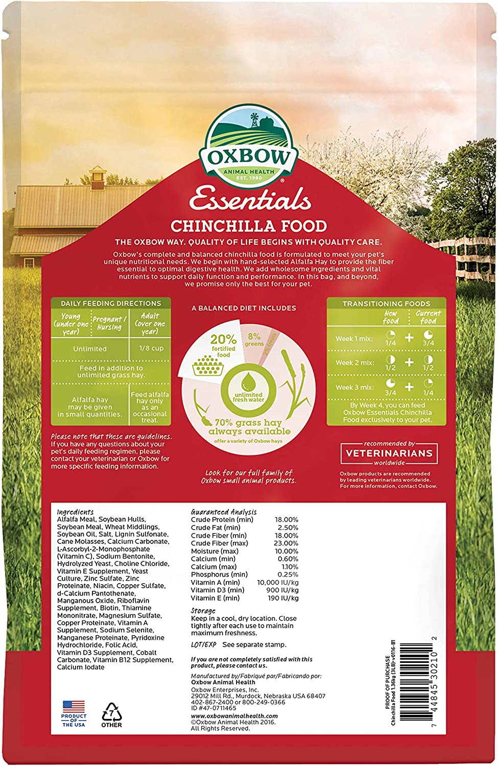 At Oxbow Animal Health, our purpose is to help people and pets live happy, healthy lives. For more than 30 years, we’ve partnered with leading veterinarians and nutritionists to develop nutrition and care products that meet the specific species and life stage needs of rabbits, guinea pigs, chinchillas, hamsters, gerbils, rats, and mice. From farm fresh hays and nourishing fortified foods to wholesome treats, beneficial supplements, enrichment and care, Oxbow products are used and recommended by leading veterinary professionals and passionate pet parents worldwide. Oxbow’s Essentials - Chinchilla Food is formulated to meet the specific nutritional needs of chinchillas of all ages. This complete and balanced chinchilla food contains Alfalfa hay to provide optimal energy and the fiber essential for healthy digestion. We then add wholesome ingredients and vital nutrients to meet the daily function and performance needs of all chinchillas. FEEDING INSTRUCTIONS: For young chinchillas, feed Essentials - Chinchilla Food free-choice to chinchillas younger than one year of age. Supplement daily with a combination of free-choice grass hay and alfalfa. For adult chinchillas (chinchillas older than one year of age), feed 1/8 - 1/4 cup Oxbow Essentials - Chinchilla Food and free-choice grass hay. Alfalfa hay should only be fed as an occasional treat. Please note that these are guidelines.