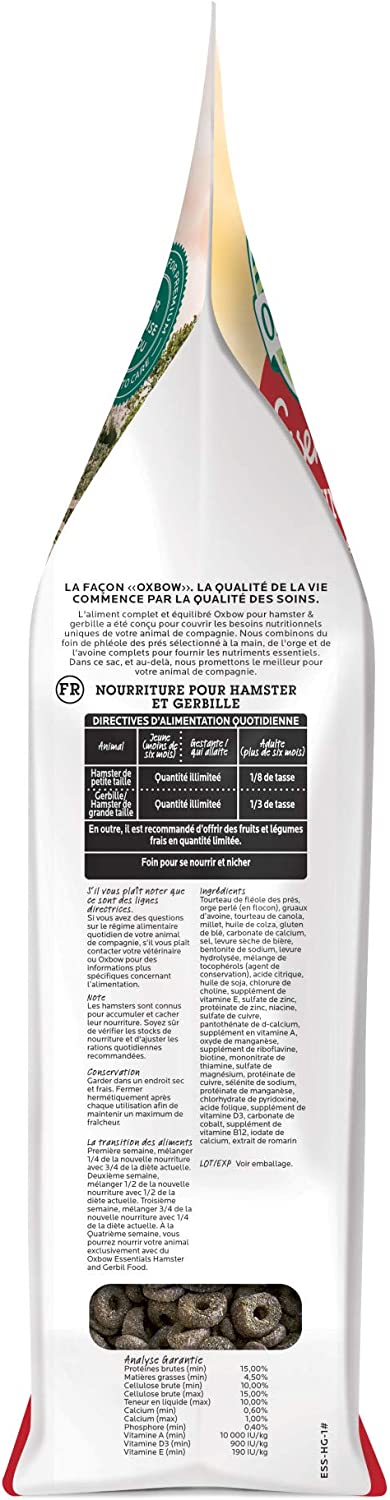 At Oxbow Animal Health, our purpose is to help people and pets live happy, healthy lives. For more than 30 years, we’ve partnered with leading veterinarians and nutritionists to develop nutrition and care products that meet the specific species and life stage needs of rabbits, guinea pigs, chinchillas, hamsters, gerbils, rats, and mice. From farm fresh hays and nourishing fortified foods to wholesome treats, beneficial supplements, enrichment and care, Oxbow products are used and recommended by leading veterinary professionals and passionate pet parents worldwide. Oxbow’s Essentials - Hamster & Gerbil Food is formulated with the guidance of top exotics veterinarians to meet your pet hamster or gerbil’s unique nutritional needs. We combine hand-selected Timothy Hay with wholesome barley and oats to provide vital nutrients that support daily function and performance in hamsters and gerbils. FEEDING INSTRUCTIONS: Young (under six months) or Pregnant / Nursing Small Hamster or Gerbil/Large Hamster: Unlimited Adult (over six months) Small Hamster: 1/8 cup Adult (over six months) Gerbil/Large Hamster: 1/3 cup. While hamsters and gerbils don’t require hay as a staple in their diet, be sure to offer them free choice hay to burrow and hide in. Please note that these are guidelines.