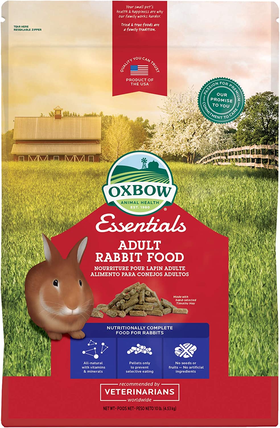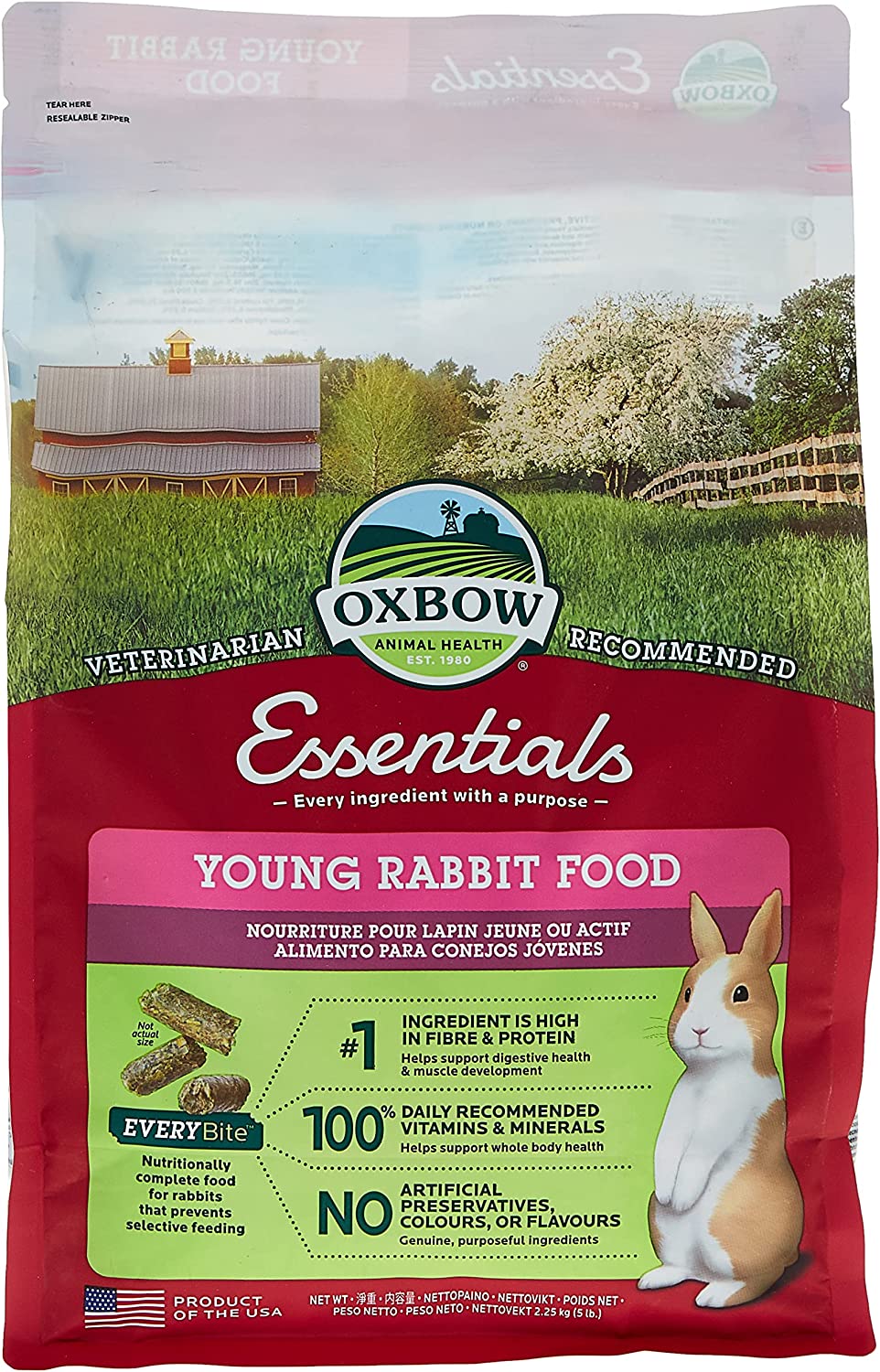 At Oxbow Animal Health, our purpose is to help people and pets live happy, healthy lives. For more than 30 years, we’ve partnered with leading veterinarians and nutritionists to develop nutrition and care products that meet the specific species and life stage needs of rabbits, guinea pigs, chinchillas, hamsters, gerbils, rats, and mice. From farm fresh hays and nourishing fortified foods to wholesome treats, beneficial supplements, enrichment and care, Oxbow products are used and recommended by leading veterinary professionals and passionate pet parents worldwide. Oxbow’s Essentials - Young Rabbit Food is formulated to meet the specific nutritional needs of young rabbits and help them thrive. Uniform rabbit pellets prevent unhealthy selecting eating tendencies commonly found with mix-based diets. This complete and balanced young rabbit food contains Alfalfa hay to provide optimal protein and fiber for healthy digestion. We add wholesome ingredients and vital nutrients to support daily function and performance, making Essentials - Young Rabbit Food the ideal diet for young and growing rabbits. FEEDING INSTRUCTIONS: Growing (under one year) - Unlimited pellets daily in addition to unlimited grass hay. Pregnant/Nursing - Unlimited pellets daily in addition to unlimited grass hay. Alfalfa hay may be given in small quantities. Please note that these are guidelines.