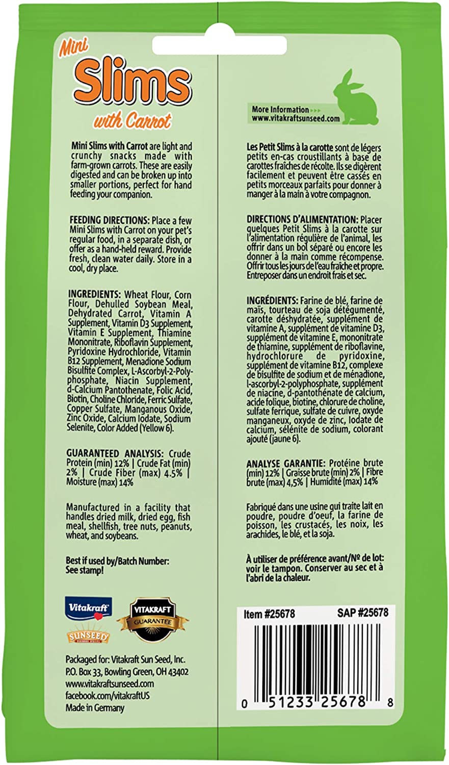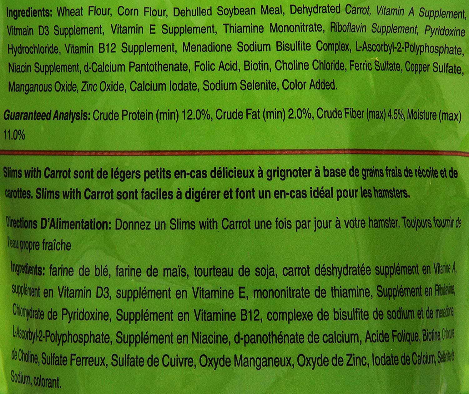 Made with tasty farm-grown carrots and harvest fresh grains, Slims with Carrot are an excellent nibbling treat for small animals that can be offered daily. The crunchy, oven baked texture provides a fun outlet for natural chewing instincts and helps promote healthy teeth.