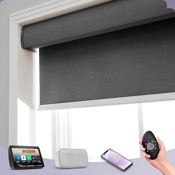 Graywind Motorized Roller Shades Work with Alexa Google Smart Blackout Shades with Remote Insulated Triple Weaved Fabric Window Blinds with Valance for Smart Home Office, Customized Size (Dark Grey)