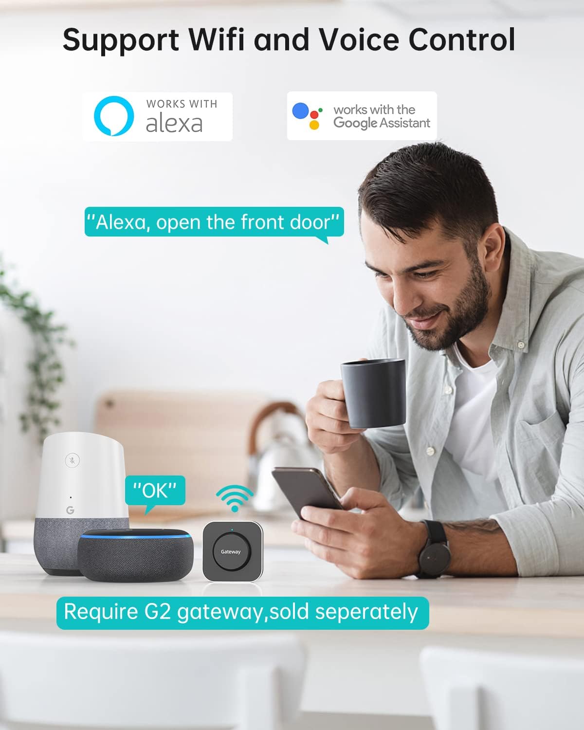 • Voice Control: The G2 gateway works with Alexa (Alexa not included) to voice control smart locks. No restrictions on pairing, one gateway can pair multiple smart locks.